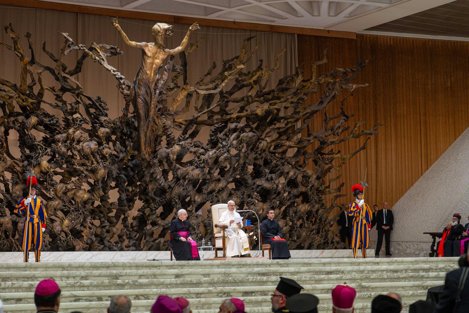 Az Egyház fáradhatatlanul fogja ismételni: Le a fegyverekkel! És szeretnék hálát adni Istennek azokért, akik csendben, imádságban, felajánlással a békét szövögetik; és a keresztényekért – keleti és latin keresztényekért –, akik, különösen a Közel-Keleten, kitartanak földjeiken, akik erősebbek, mint annak kísértése, hogy elhagyják otthonukat. A keresztényeknek meg kell adni a lehetőséget, nem csak szavakban, hogy földjeiken maradhassanak a biztonságos léthez szükséges összes jogokkal. Kérlek benneteket, dolgozzatok ezen!