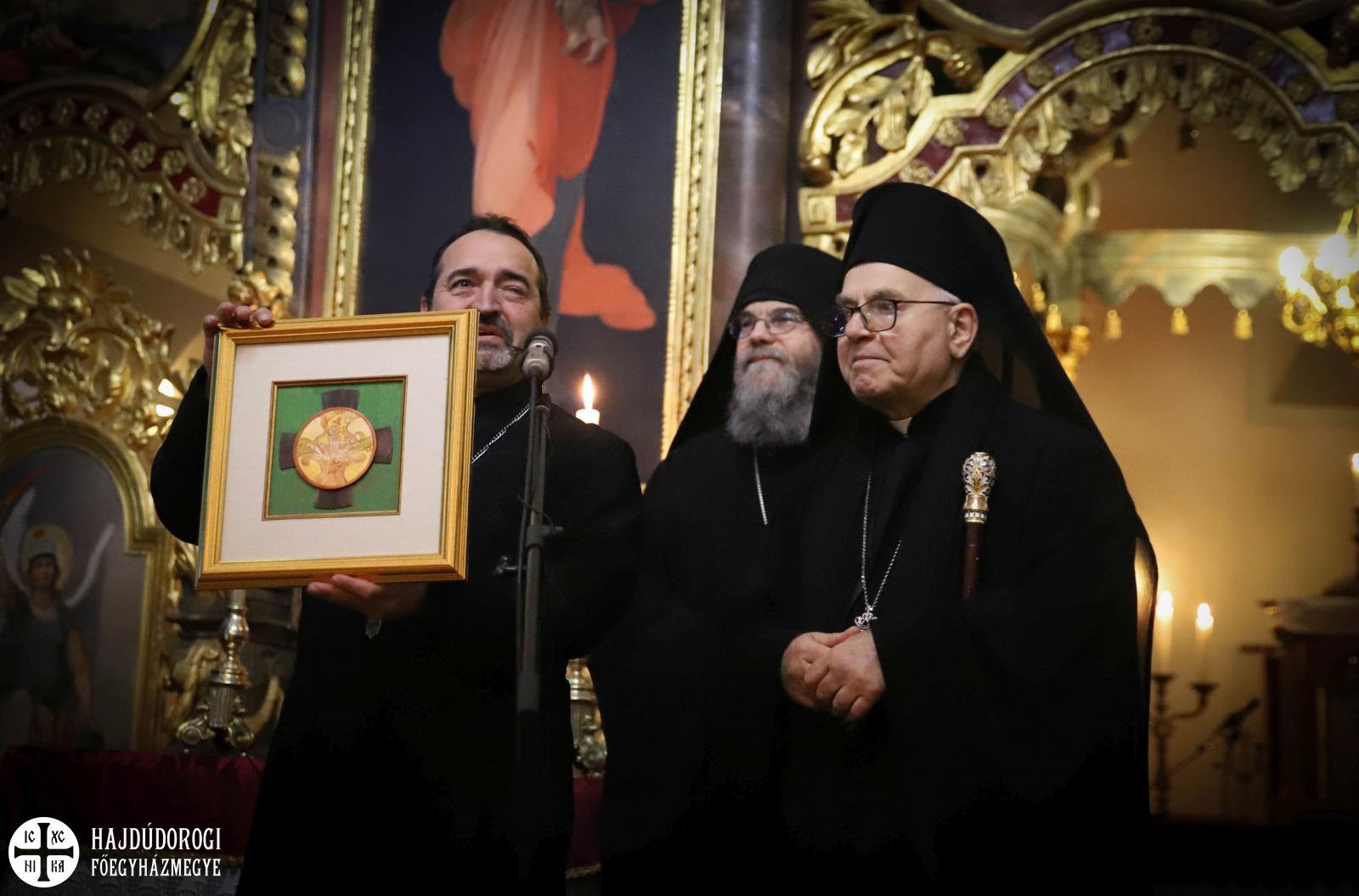 Dalanics Zoltán parókus atya is köszöntötte az egybegyűlteket, majd két ajándékot is átadott a melkita érseknek. Mesélt neki a Krisztus katonaságról, amely idén lett a Nemzeti Értéktár része. Egy erről szóló kiadványt és egy kisfilmet adott át neki, illetve egy különleges műalkotást, melyet Monostori Viktória festőművész készített, kifejezetten erre az alkalomra. A keretben egy kereszt látható, ami annak a mintájára készült, amit Hajdúdorogon találtak egy honfoglalás kori sírban.