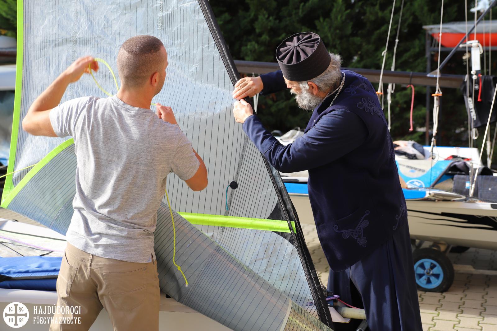 A Balatonfüredi Yacht Club (BYC) színeiben versenyző testvérpár a délutáni előadás előtt meghívta Fülöp atyát, hogy bemutassák versenyhajójukat és részt vegyen az edzésükön.
