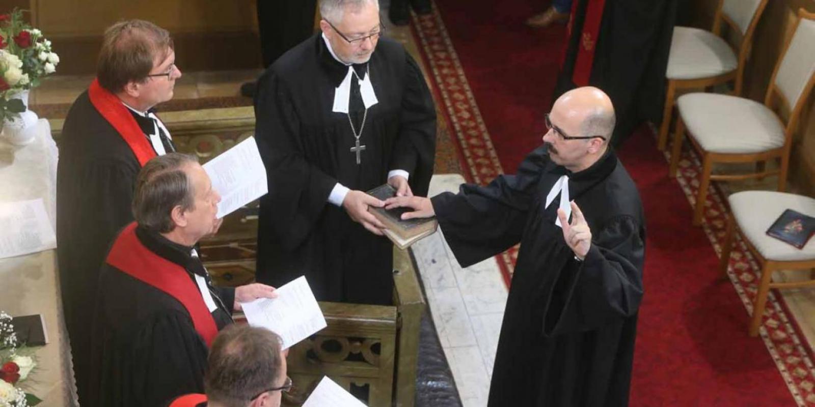 A templom zsúfolásig megtelt sorai között az egyházkerületi, egyházmegyei, valamint egyházközségi tisztségviselők és presbiterek után Finta Gergely orgonajátékára vonult be dr. Fabiny Tamás, az egyház elnök-püspöke, az Északi Evangélikus Egyházkerület püspöke, aki az igehirdetés és a gyülekezettel közösen elmondott hitvallás után tette fel iktató kérdéseit az avatandó püspök felé. Az oltár előtt elhangzott két határozott válasz után, elköteleződése jeléül, nyújtotta jobbját Kondor Péter, majd ugyanezen kezét a bibliára, míg bal kezének első három ujját a levegőbe emelve mondta el a püspöki esküt. Végül Fabiny Tamás átadta számára a keresztet, a püspöki szolgálat jelvényét.