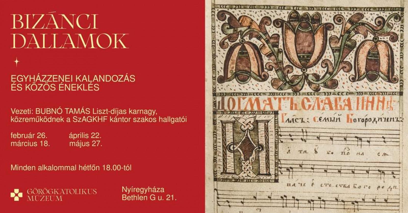 A "Bizánci dallamok" programsorozat második eseményét rendezik meg hétfőn. A kiállítótérben tartott rendezvény során Bubnó Tamás karnagy zenetörténeti bevezetője kíséretében hangzanak el dallamok, amely közös énekléssel folytatódik. Az énekek megtanulásában a Szent Atanáz Görögkatolikus Hittudományi Főiskola kántor szakos hallgatói lesznek segítségünkre.