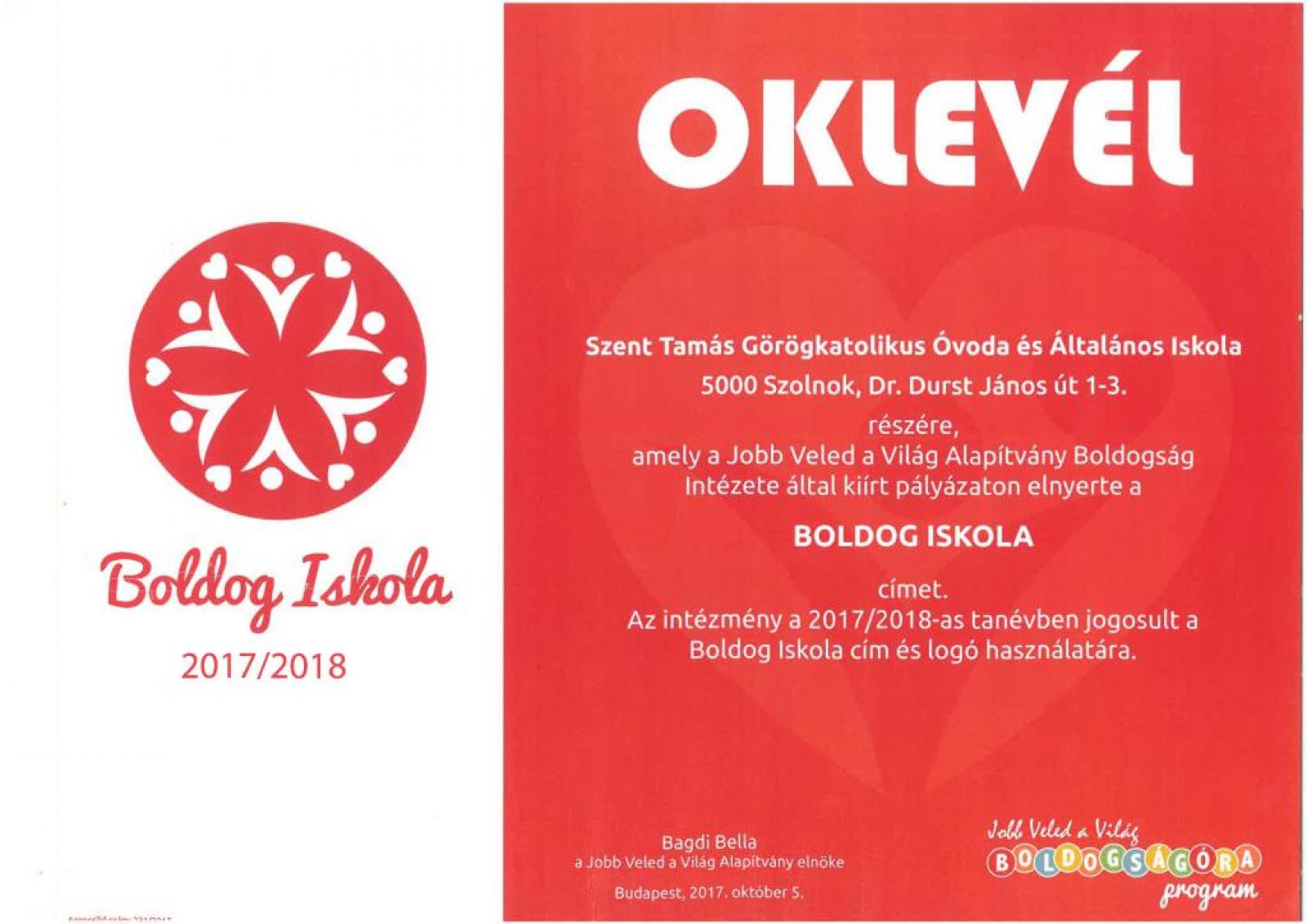 Különleges oklevelet kapott a szolnoki Szent Tamás Görögkatolikus Óvoda és Iskola. A Jobb Veled a Világ Alapítvány Boldogság intézete írta ki a pályázatot, amelyet sikerrel vett a szolnoki iskola. Így az intézmény egy évig viselheti a Boldog Iskola címet! Gratulálunk!