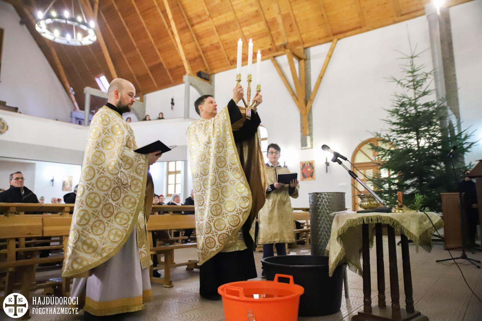 Ez tulajdonképpen Urunk megkeresztelkedésének ünnepe, amelyet görögül „Theofánia” néven emlegetnek a liturgikus könyvek. Debrecenben is sokan összegyűltek a délelőtti Szent Liturgiára, melyen Szaplonczay Márk atya úgy fogalmazott: „A mai napon Isten nemcsak megtestesült, nemcsak azzal mutatta meg az emberszeretetét, hogy leérkezik a földre, hanem azzal is megválasztja magát, hogy megengedte az embernek, hogy keresztségben részesítse, és ezzel megszentelte a vizeket. Krisztusban szeretett testvérek, az ünnepi ikonon láthatjuk, ahogy Jézus van most a középpontban. Talán, ha lehetne mondani, méltó helyet kapott az Isten fia, hiszen megdicsőült, hogy az Atya szózata hangzott fel, hogy ez az én szeretett fiam, akiben nekem kedvem telik. Ugyanakkor mégis azt látjuk, hogy ugyanúgy, mint ahogy az ő megtestesülésekor megtapasztaltuk: az az alázat, azt a megalázkodást tőle most is megtapasztalhatjuk, hiszen nem tűnik olyannak, mint valami uralkodó, aki most megmutatja azt, hogy hogyan kell megszentelni a vizeket, hanem megkéri alázatos szolgáját, Keresztelő Szent Jánost, hogy ő legyen az, aki megszenteli őt a Jordán folyóban. A képen láthatjuk azt, hogy a feltornyosuló hullámai a Jordánnak szimbolizálják, amit énekeltünk is, hogy a Jordán visszafordult. És ugyanígy a bűnös emberi élet is most visszafordulhat ezen az ünnepen. A jó irányba, az Isten felé vezető irányba, hiszen nagyon nehéz a vizet visszafordítani, és amikor egy bűnbe beleragad valaki, akkor nehéz abból visszafordulni. Szinte olyan lehetetlen küldetés, mint egy folyóvizet visszafordítani. Ugyanakkor az Isten segítségével ez is lehetséges.