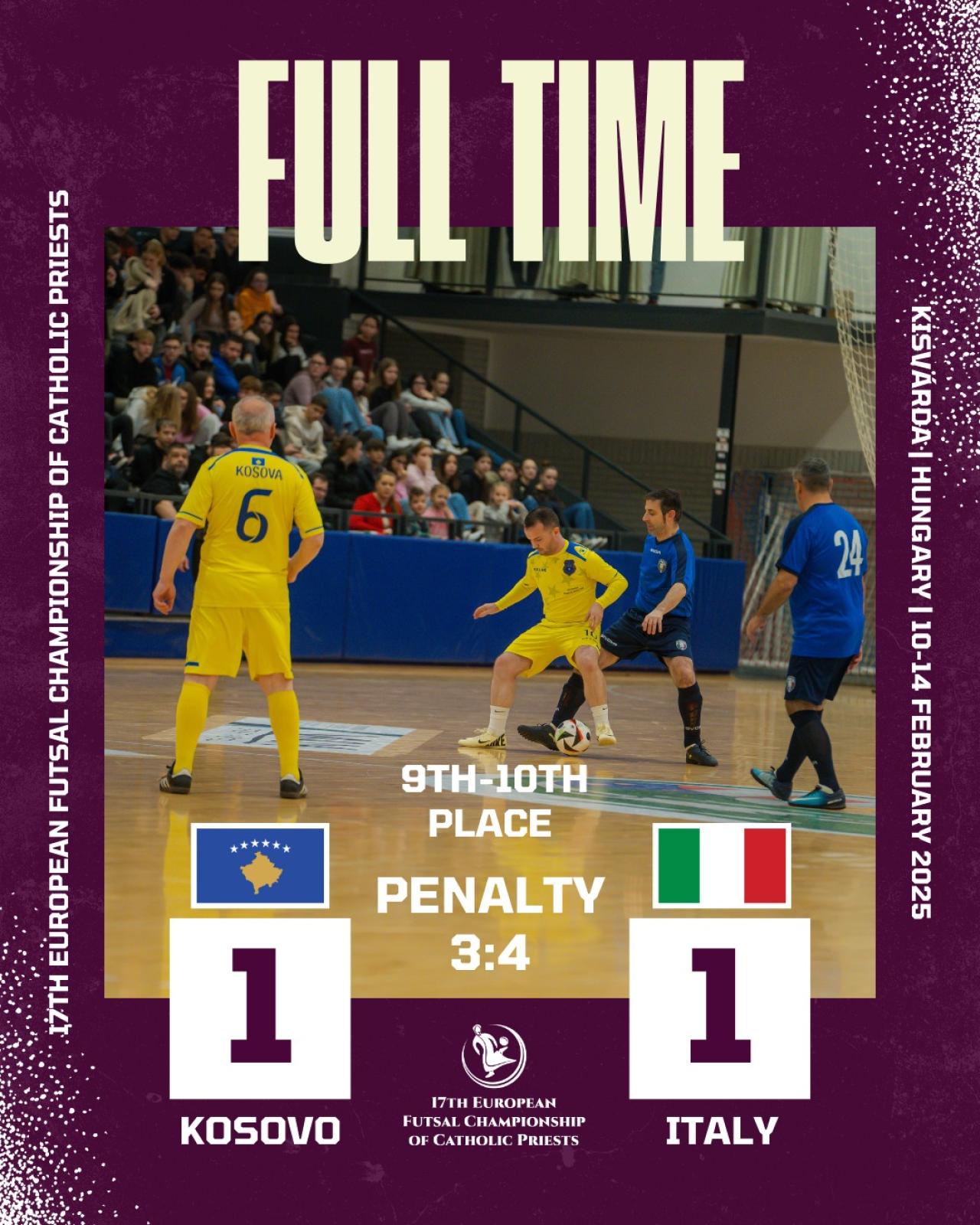 A Koszovó-Olaszország mérkőzésen rengetegen szurkoltak mindkét csapatnak, hiszen játékosaik a pályán lelkesek, azon kívül barátságosak. Közelebb állt Koszovó a gólhoz, de a közönségkedvenc olasz kapus mindent védett, azt is, amit már bent láttunk. Az, hogy Koszovó a félidőben nem vezetett hárommal, kizárólag Bonifacio atya érdeme volt. A második félidő 6. percében gólt kiáltott a lelátó népe, de oldalháló volt. Két perccel a vége előtt érett góllá a koszovóiak mezőnyfölénye. Az olaszok konkrétan a semmiből egyenlítettek, egy kezezés utáni büntetőből. Döntetlen lett a vége, elsőként következtek a tornán büntetőrúgások. A stadion majd’ fölrobbant minden gólnál, fej-fej mellett haladt a két csapat, rendkívül izgalmas volt a közönségkedvencek párbaja. Az olaszok edzője nem merte nézni, hátat fordítva izgult végig minden egyes rúgást. Az apró termetű Bonifacio atya most is remekelt, kettőt kifogott, s mivel elfogytak a játékosok, az utolsó lövést neki kellett elvégeznie – olasz vezetésnél. Ha berúgja, övék a 9. hely. Szürreálisnak tűnt az apró termetű kapus hatalmas kesztyűivel ebben a nagy, tomboló stadionban, nehéz teherrel a vállán. Ő azonban mosolyogva hergelte még feljebb a hangulatot a lelátón, csibészkedett is egy kicsit, fél méterrel előrébb rakva a labdát, mintha mi sem lenne természetesebb – a bíró is mosolyogva tette vissza a játékszert a büntetőpontra. A sípszó után Bonifacio atya nekifutott – és berúgta a mindent eldöntő gólt. Fölrobbant a stadion, ő ugrált, csúszkált, a társai pedig „szétszedték” őt örömükben. Igazi „show”-t láthatott a közönség.