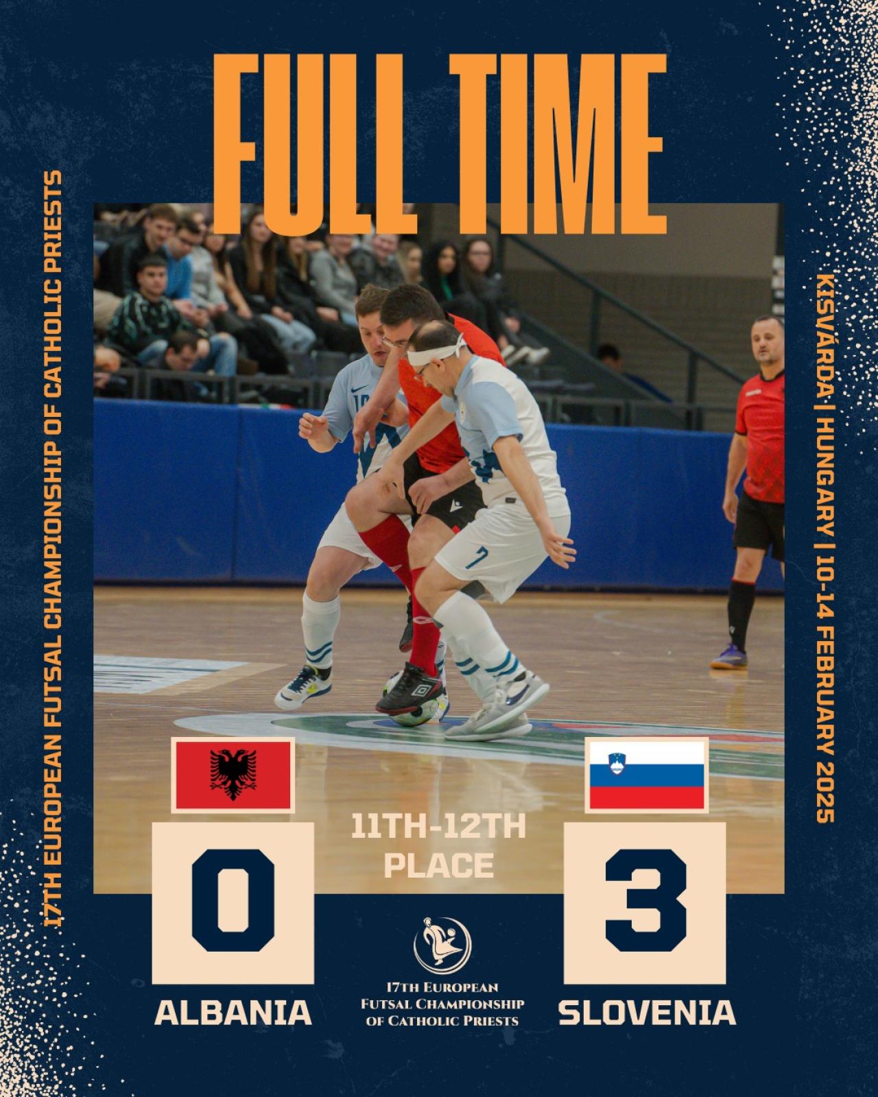 Ezután a csoportok harmadik helyezettjei csaptak össze egymással, először Albánia és Szlovénia. A szlovénok nagyon gyors góllal adták meg a mérkőzés alaphangját. Nem játszottak rosszul az albánok sem, de a szlovénok jobbak voltak. Egy nagyon szép támadás végén sakk-mattig kijátszották az akciót a második félidő 3. percében, 2–0. Két perccel később egy újabb szép támadással eldöntötte a meccset Szlovénia. Az utolsó 6 perc tétje a becsületgól volt Albánia részéről. Nem jött össze, a szlovének elbántak az albánokkal – csak a kapuson, Martin Jakun múlt, hogy csupán 3 góllal.