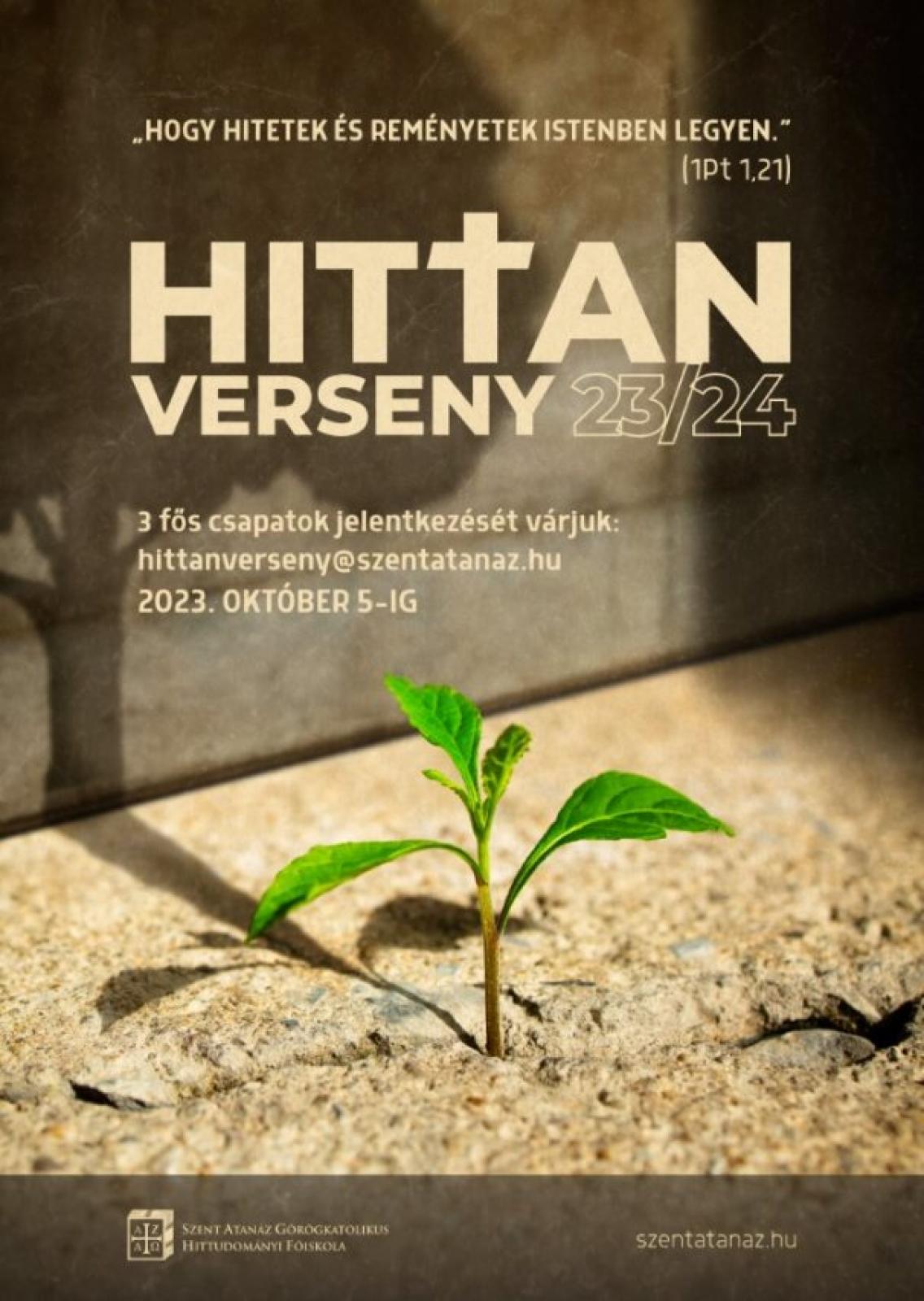 Témája a remény és a bizalom a Szentírásban, a történelemben, a liturgiában és a lelki életben. A versenyre háromfős középiskolai csapatok jelentkezését várjuk. Jelentkezni a Szent Atanáz Görögkatolikus Hittudományi Főiskola alábbi elérhetőségein lehet: