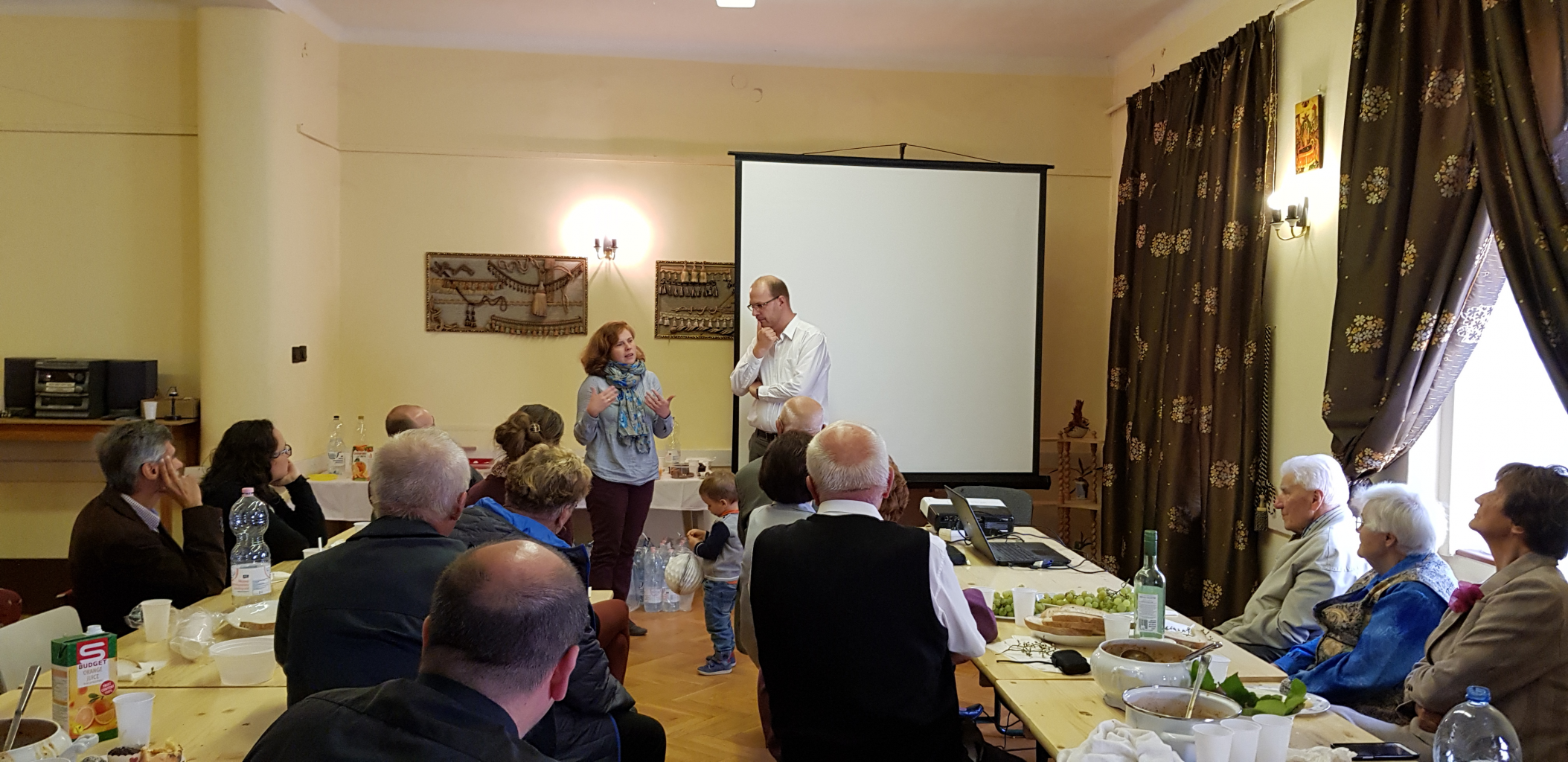 Majd előadások sorozata következett, melyet Girán János – egyházközségünk oszlopos tagja - nyitott, ismertetve a hallgatósággal a május 25-én Hajdúdorogon megrendezett Metropóliai családi napon hallottakat. Ezután Orova Csaba és Bodnár Boglárka osztotta meg személyes tapasztalatait a kisdedek áldoztatása kapcsán, amit a három esztendős Csabika révén élnek meg. Az Ő előadásuk témáját zárta Gábor atya pár mondatos gyakorlati tapasztalata.