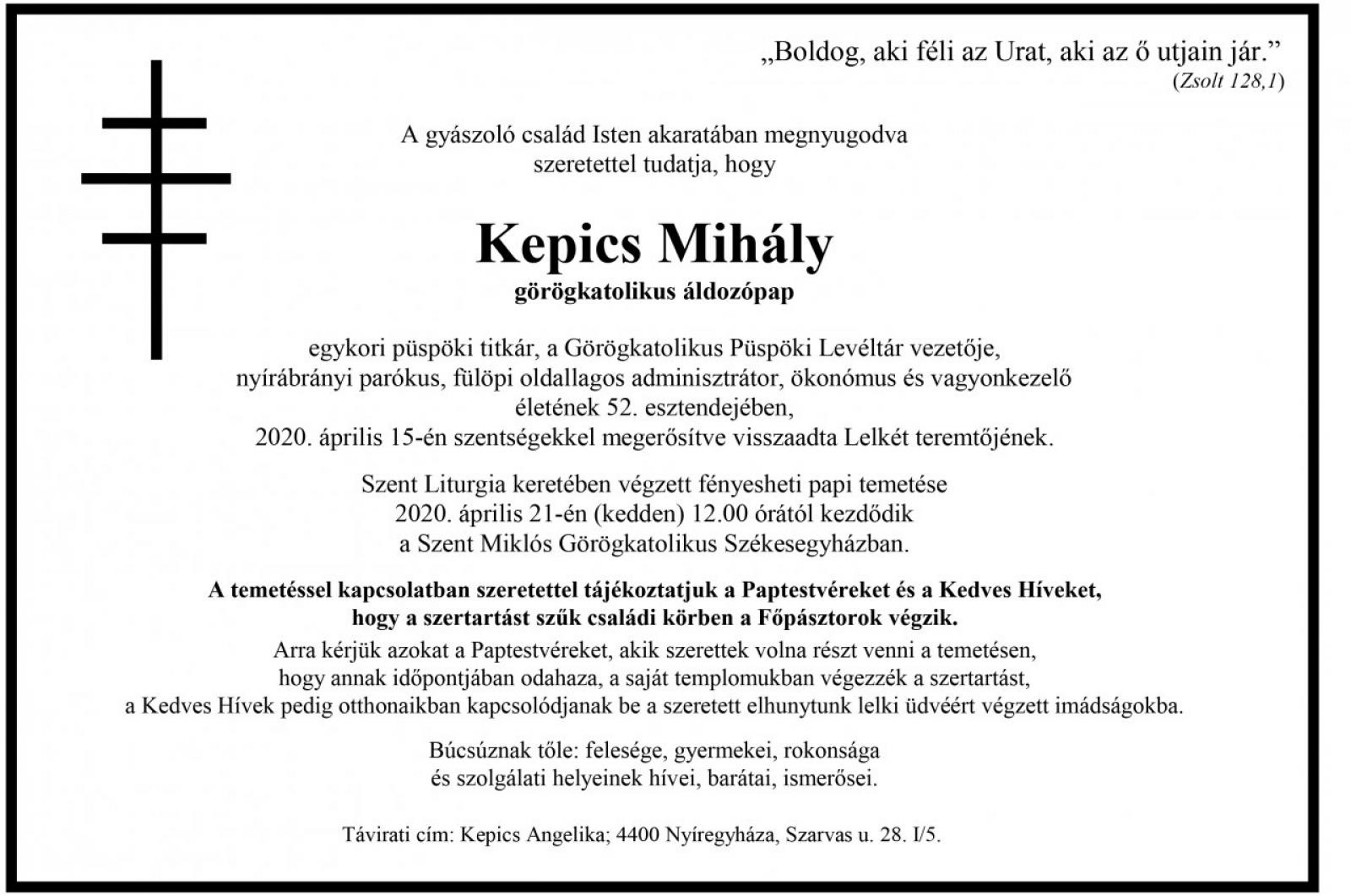 Szent Liturgia keretében végzett fényesheti papi temetése 2020. április 21-én (kedden) 12.00 órától kezdődik a Szent Miklós Görögkatolikus Székesegyházban.