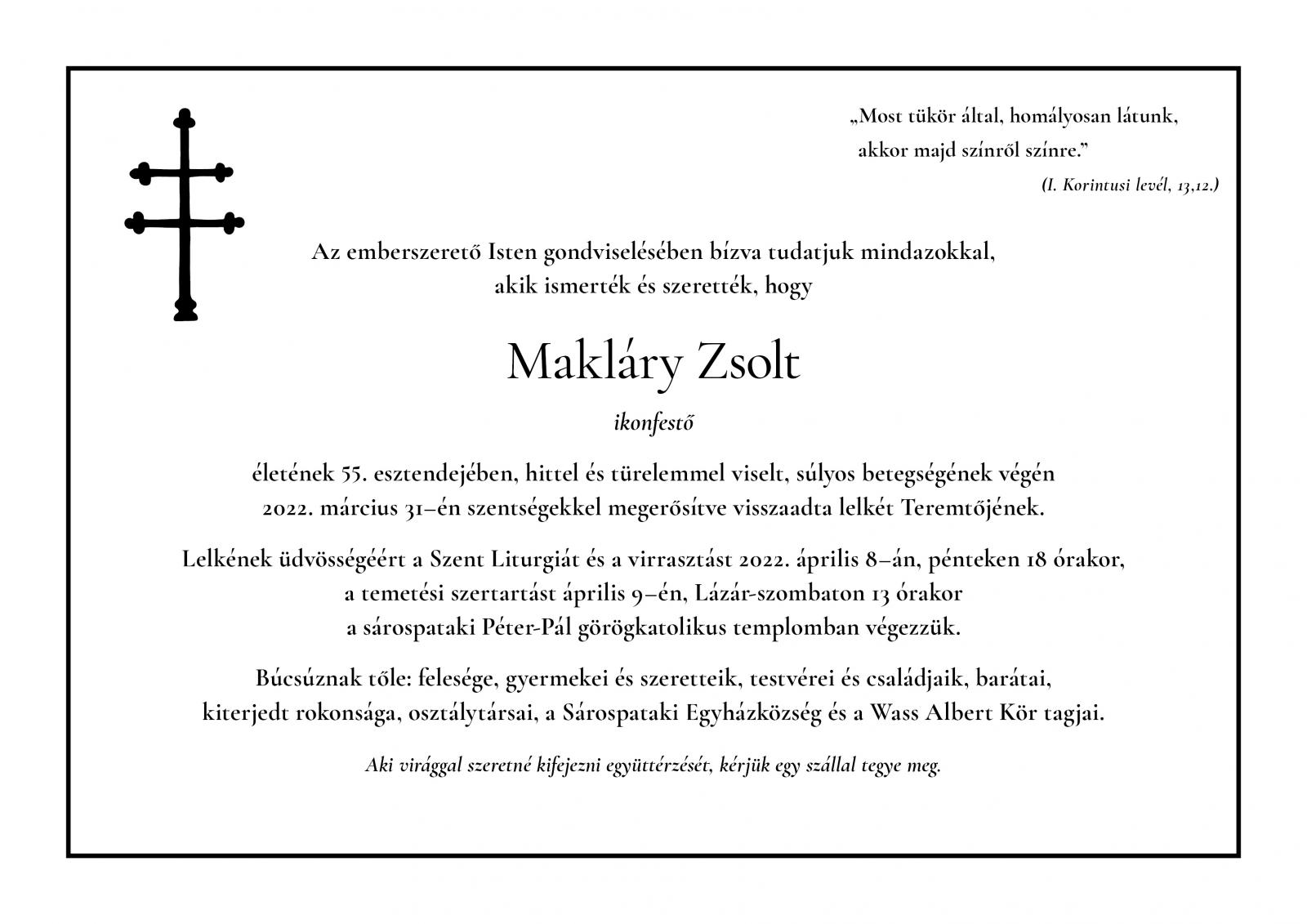 Az emberszerető lsten gondviselésében bízva tudatjuk mindazokkal, akik ismertek és szerették, hogy Makláry Zsolt ikonfestő életének 55. esztendejében, hittel és türelemmel viselt, súlyos betegségének végén 2022. március 31-én szentségekkel megerősítve visszaadta lelkét Teremtőjének.