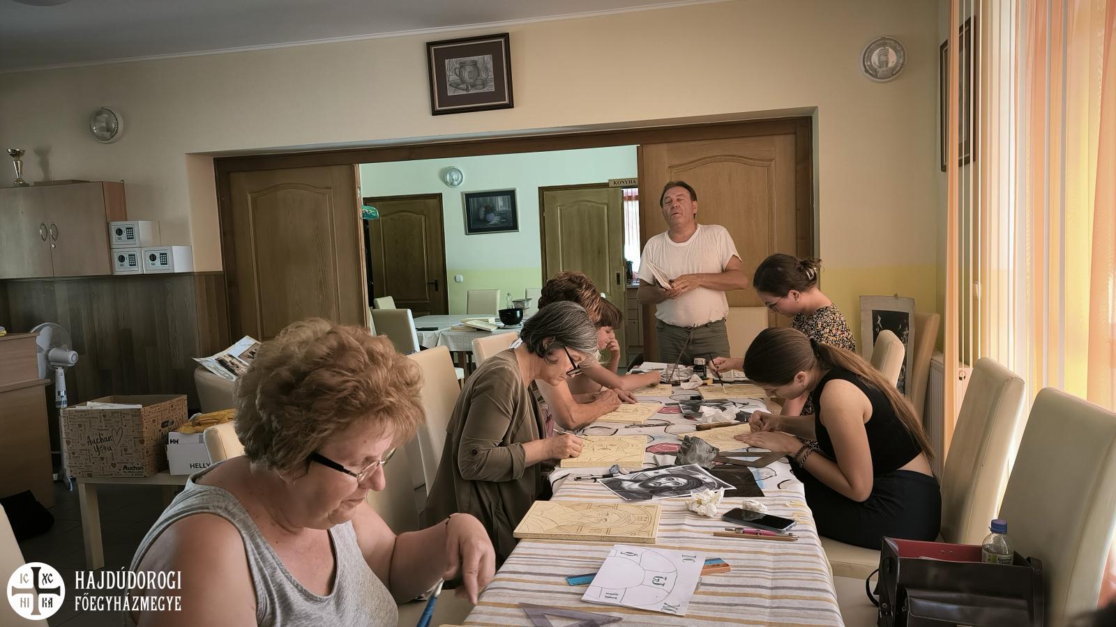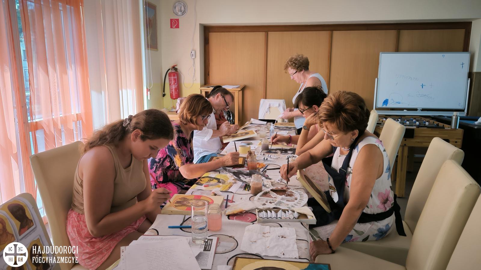 A hajdúk fővárosát a köztudatban a festők városaként is emlegetik. Az ikonfestő tábor szervezése Sőrésné Molnár Mária realista festőnk gondolatában fogalmazódott meg, akit egyre jobban foglalkoztat a szakrális művészet. Tavaly ősszel az általa festett Szent Trifon ikont szentelte fel Zolcsák Miklós atya templomunkban. Innen indult az elhatározás, hogy szervezzünk tábort Miklós atya vezetésével. Augusztus utolsó hetében egyházközségünk biztosította a helyet a Mamre Szálló közösségi terében.