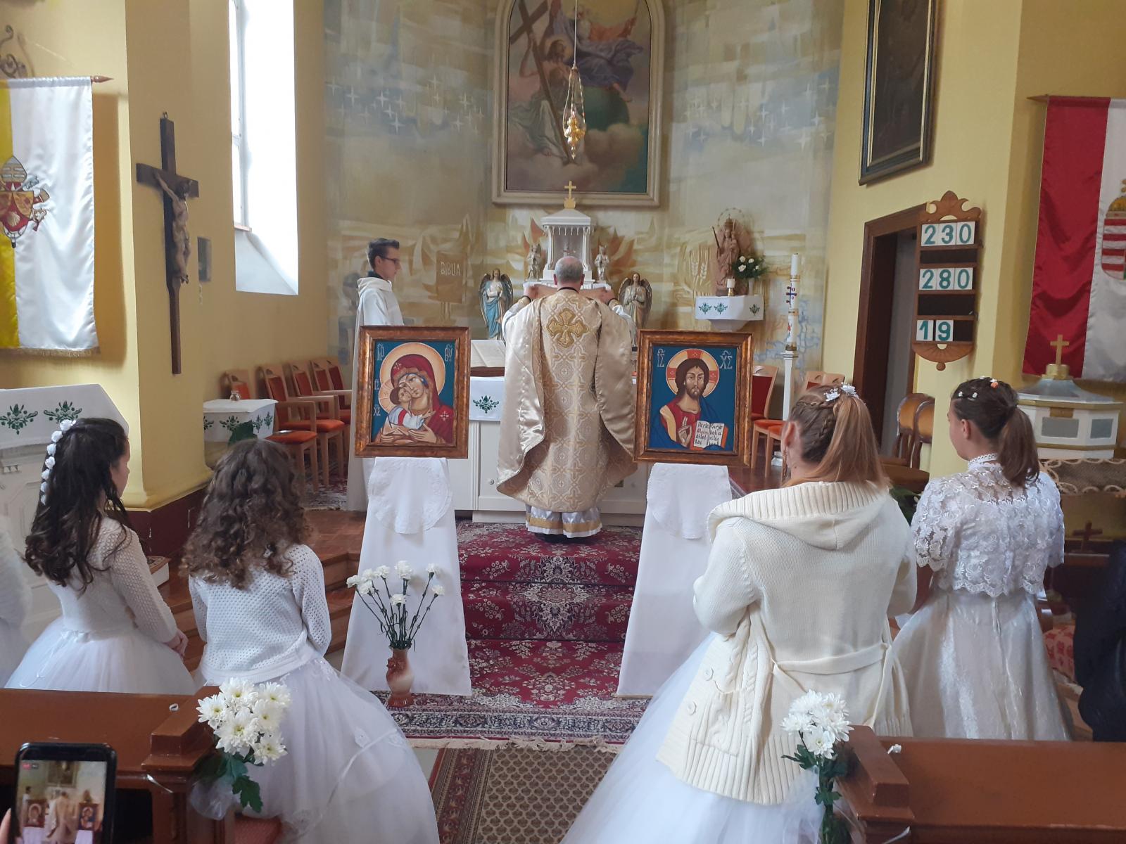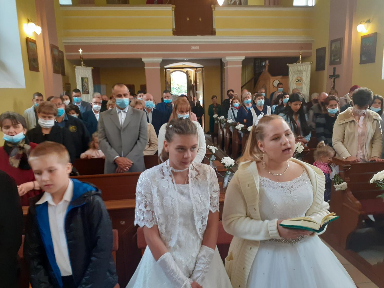 A pandémia miatt az elsőáldozók sem teljes létszámban jelentek meg, voltak, akik a járvány időszaka után szeretnének részesülni az Eucharisztia szentségében. Viszont voltak, akiket ezek a viszontagságos körülmények sem tántorítottak el attól, hogy gyönyörű ruhában egy szál fehér virággal és egy égő gyertyával az Úr asztalához járuljanak. Az ő vidám kis csicsergő hangjuk köszöntötte a templomba érkezőket. Bevonulásukkor zengett a római katolikus templom, melyet bőségesen megtöltöttek a görögkatolikus hívek. A szabályok betartásával folyt a liturgia: az ajtóban maszkokat osztogattak és kézfertőtlenítőt adagoltak Gergely atya kis segítői.