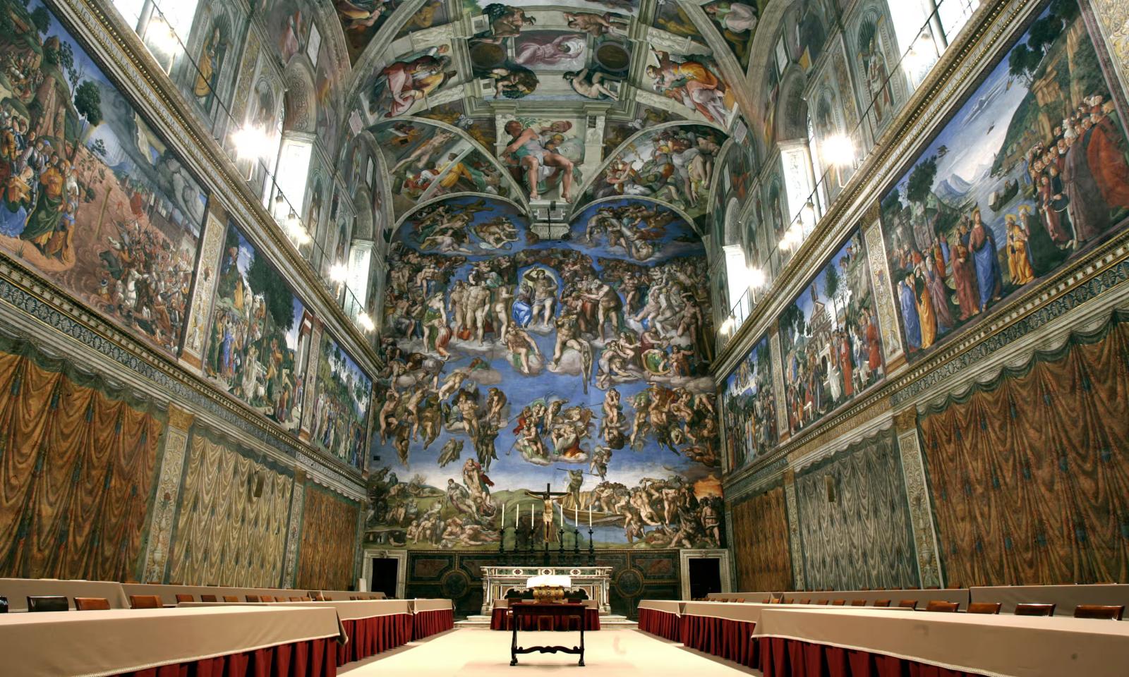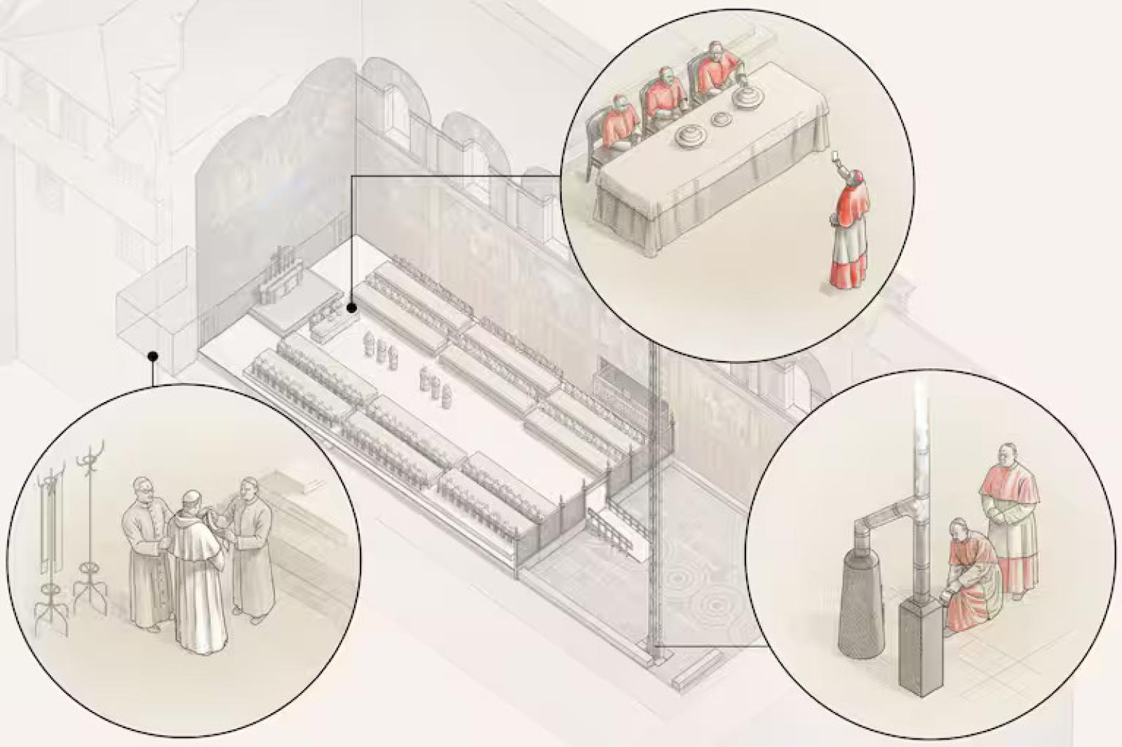 A Sixtus-kápolna két hosszanti oldalán 2-2 asztalsort helyeznek el székekkel, az oltár elé a konklávét levezető bíboros és a szavazatszámlálók asztala kerül, valamint a szavazatokat tároló urnák.