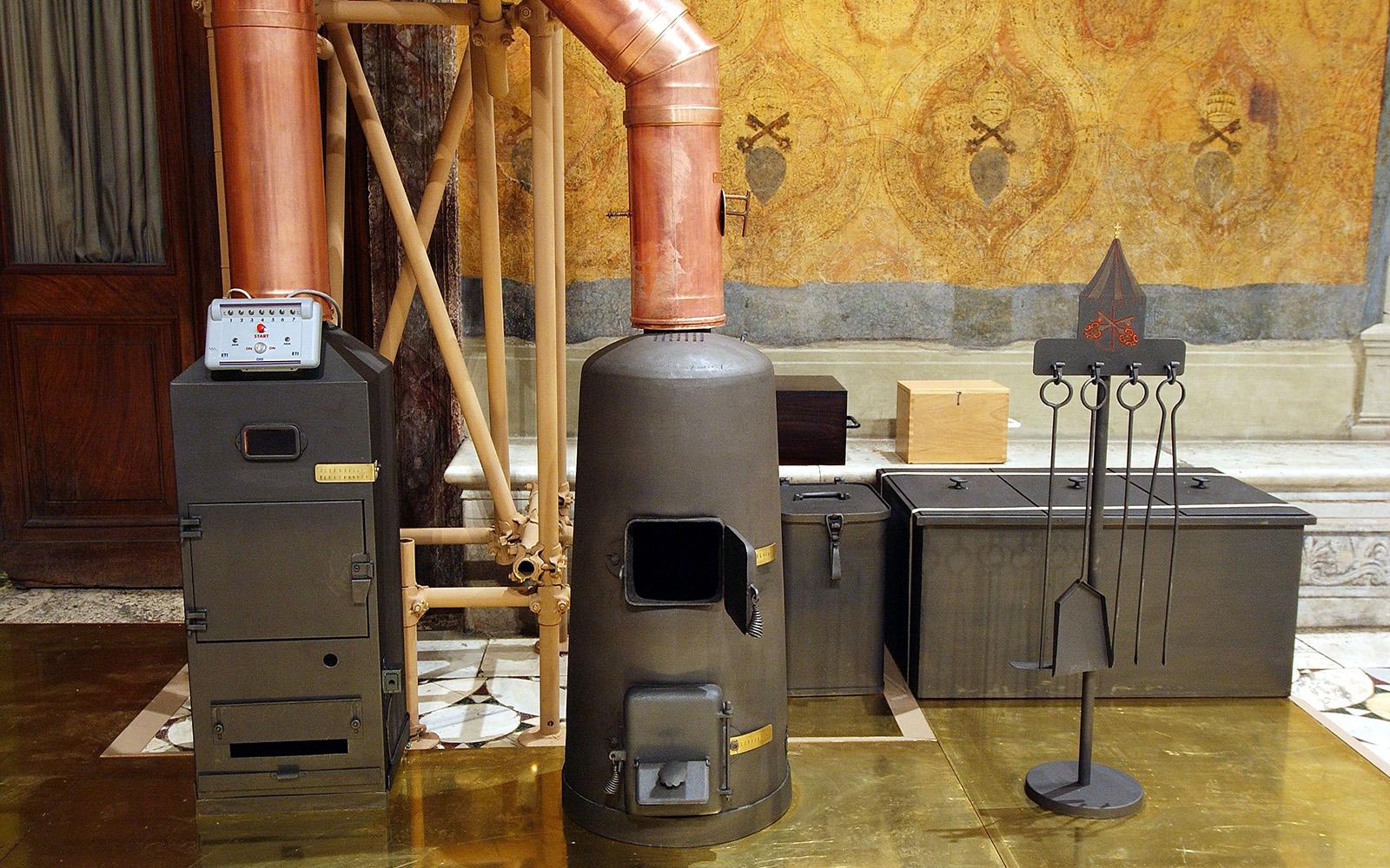 A bejárathoz közel, bal oldalon helyezkedik el a kályha, melyben a szavazatokat égetik el. Korábban harangzúgással és ágyúlövéssel adták a hívek tudtára a pápa megválasztását, 1903 óta fehér füst jelzi a hírt, melyet nedves szalmával igyekeztek minél fehérebbé tenni. A fekete füstöt kátrány hozzáadásával érték el. Mivel ez a színezési eljárás nem mindig sikerült, ráadásul 1958-ban tévesen jelent meg fehér füst, bevezették a kémiai színezést. Ma két kályha áll egymás mellett, melyek közös kéményben végződnek, ennek teteje látható a Szent Péter téren. A jobb oldali kályhába ürítik a szavazatokat, melyeket elektromos gyújtás lobbant lángra. A bal oldali kályha kétfajta kémiai összetételű patront tartalmaz, elektromos vezérléssel lehet a kívánt színűt meggyújtani, mely több percig ég, egészen addig, míg biztosan elégnek a szavazatok. A fekete színt, mely azt jelzi: nincs kétharmados többség, kálium-perklorát, antracén, naftalin és kén hozzáadásával érik el, a pápa megválasztását jelző fehér füstöt pedig kálium-klorát, laktóz és fenyőgyanta hozzáadásával.