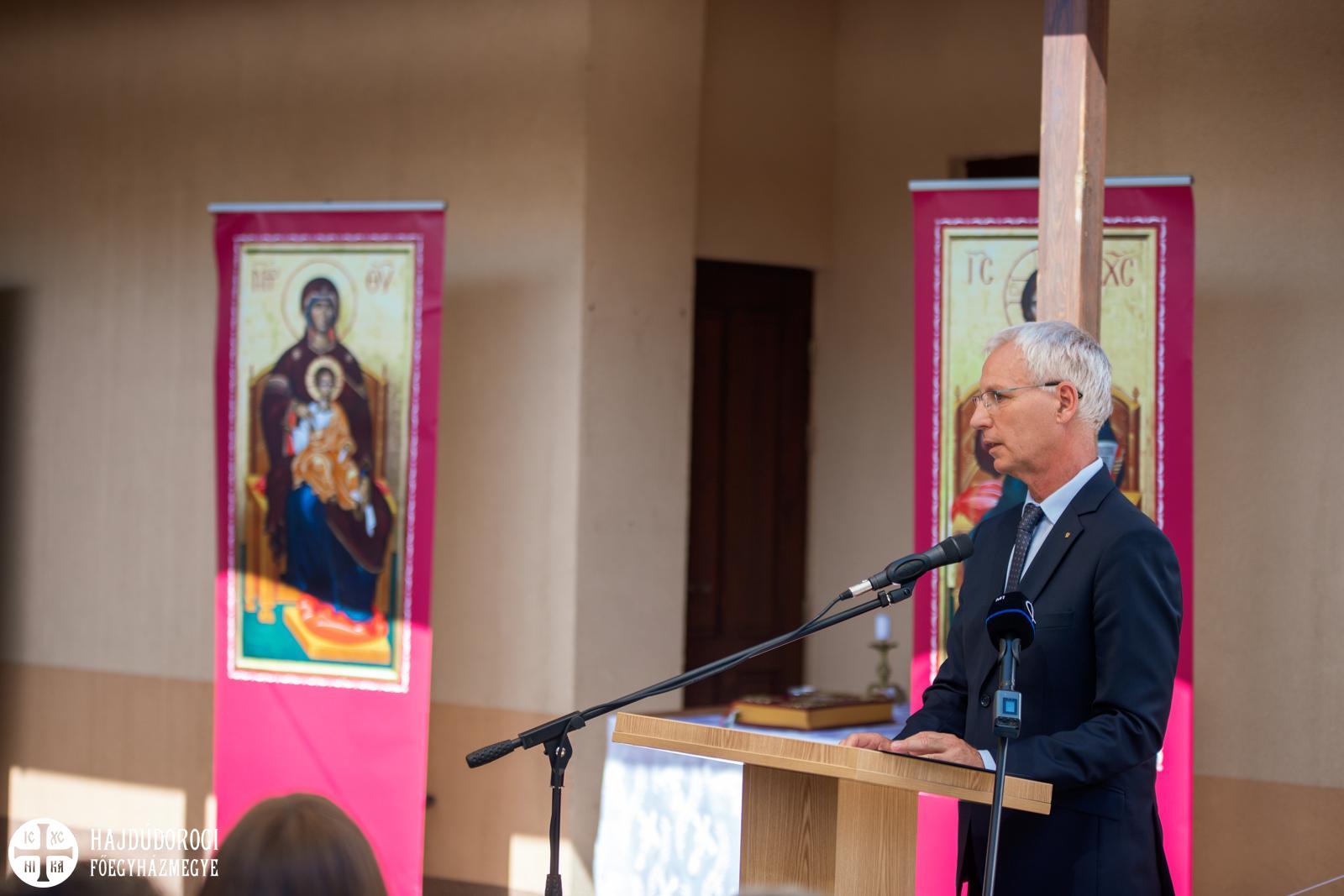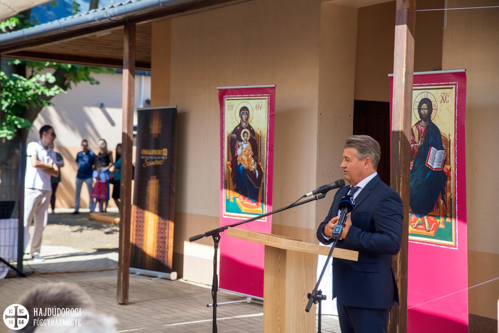 Tasó Béla polgármester arra hívta fel a figyelmet, hogy a Nyíradony szó jelentése: Üdvösségben gazdag. Kifejtette, hogy a településen mindig tisztességes, istenfélő emberek éltek, és ez az, amit a görögkatolikusság jelent a településen. – Egy város életében nagyon fontos az óvodaátadás, mert a gyermeknevelés ebben az életkorban a legmeghatározóbb, emellett az itt élő emberek lelkülete, hite és szorgalma adja a település erejét – jegyezte meg végül.