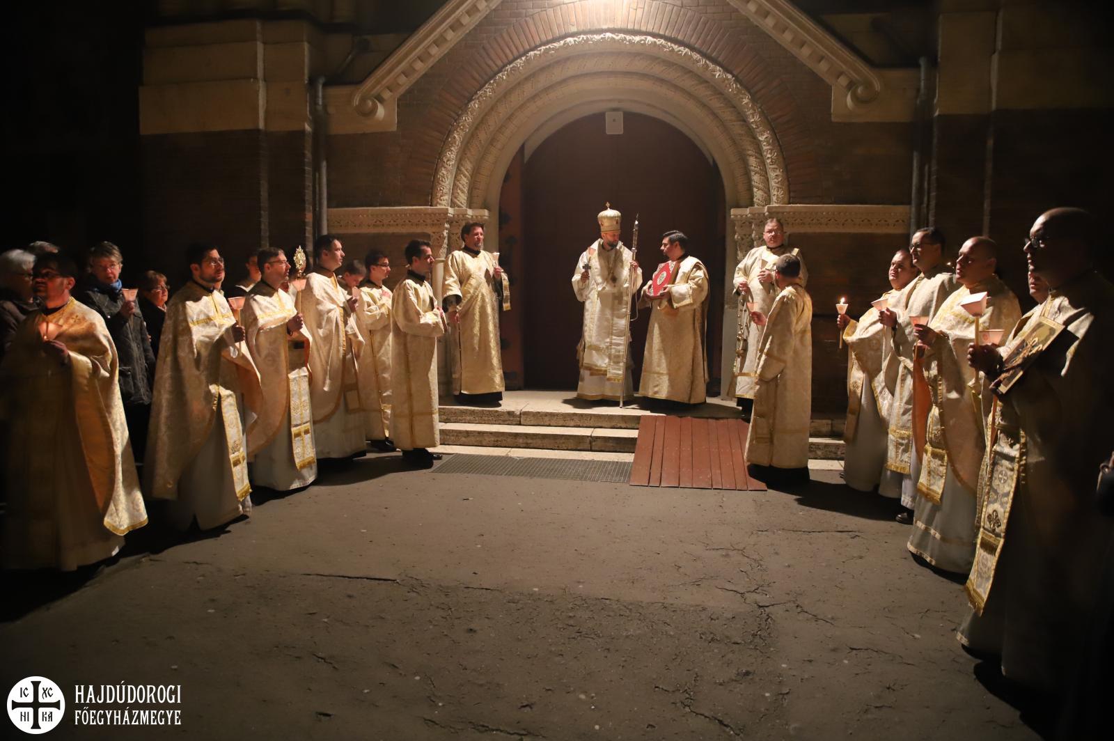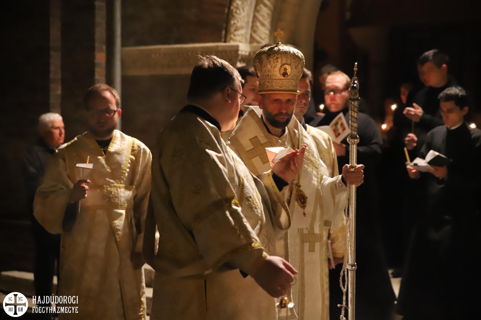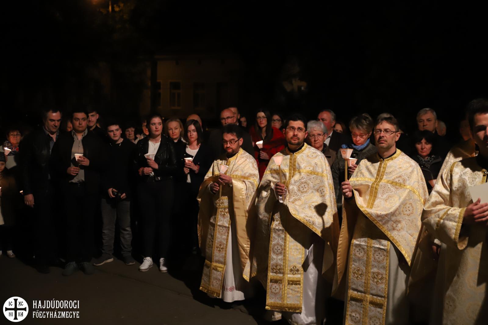 Később, az éjszakai órákban nyitott templomban virrasztottak a hívek az Apostolok Cselekedeteit olvasva, ezzel is mintegy elővételezve, hogy mit hoz, mit eredményez Krisztus föltámadása: új életet, az Egyház életét. A feltámadási szertartásra a papság levetette böjti ruháját és teljes fehér díszbe öltözött ezzel is jelezve, hogy küszöbön áll a feltámadás. A hagyományoknak megfelelően körmenet indult; a hívek meggyújtották gyertyáikat a papok gyertyájáról, így járták körül a templomot, énekelve, imádkozva.