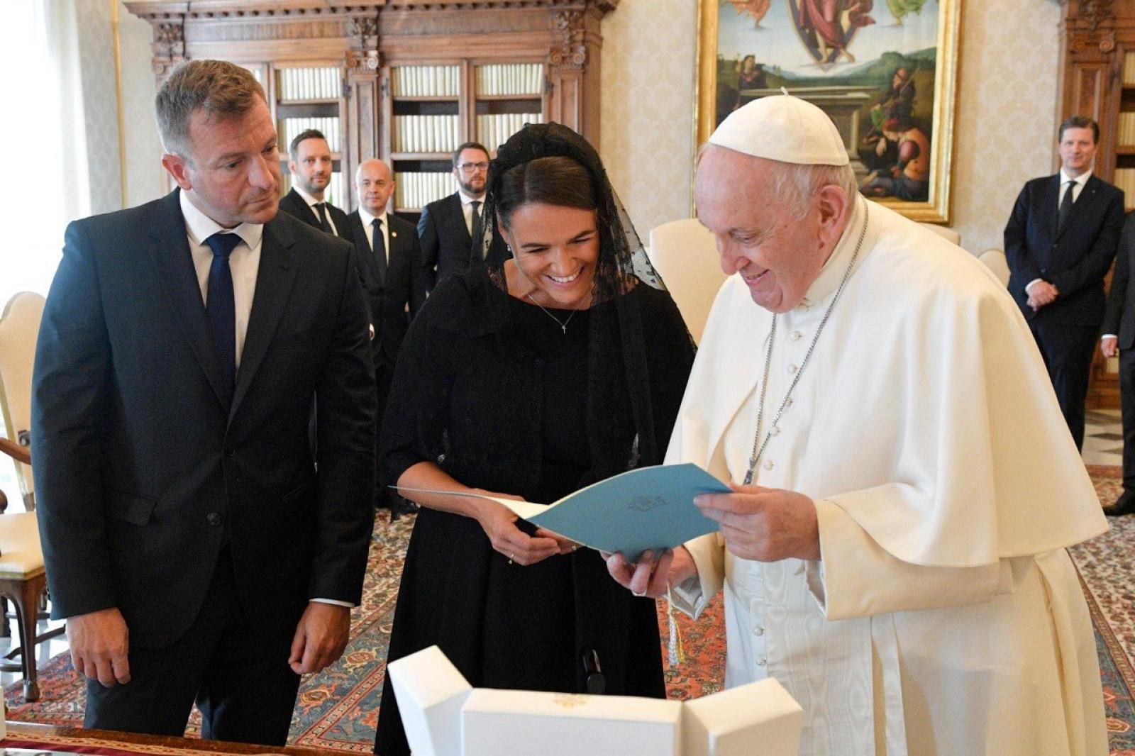 A pápai audiencia végén sor került az ajándékcserére. Ferenc pápa megajándékozta a magyar államfőt egy bronzszoborral, amely egy gyermeket ábrázol, aki segít egy másik gyermeknek felállni. Az alkotáson két felirat szerepel: „szeretni” és „segíteni”. A pápa továbbá átadta az elnökasszonynak idei Béke világnapi üzenet, az Emberi testvériségről szóló dokumentumát és a Vatikáni Könyvkiadó által kiadott kötetet, amely a pápa 2020. március 27-én a Szent Péter téren tartott Statio Orbis-szertartásának állít emléket.