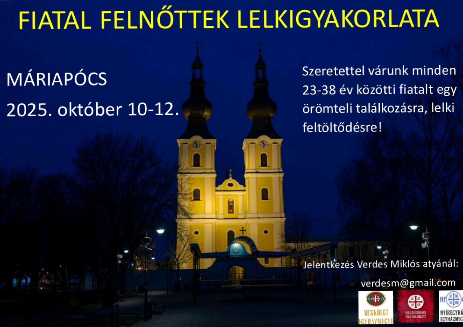 Szeretettel várunk minden 23-38 év közötti fiatalt Máriapócsra 2025. október 10-12. között! A lelkigyakorlat péntek estétől vasárnap ebédig tart, várunk szeretettel! A programban kis- és nagycsoportos beszélgetések, elmélkedések, elcsendesedés, szertartások, folyamatos gyónási lehetőség szerepel. A lelkigyakorlat költségeihez történő hozzájárulás 20.000 Ft.