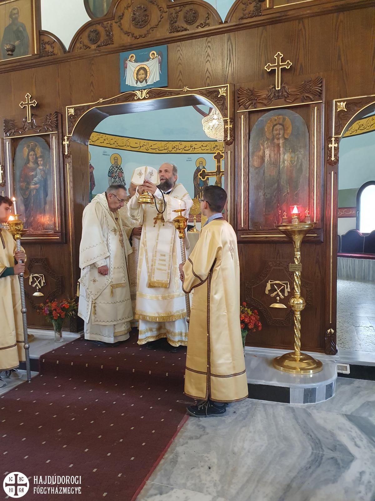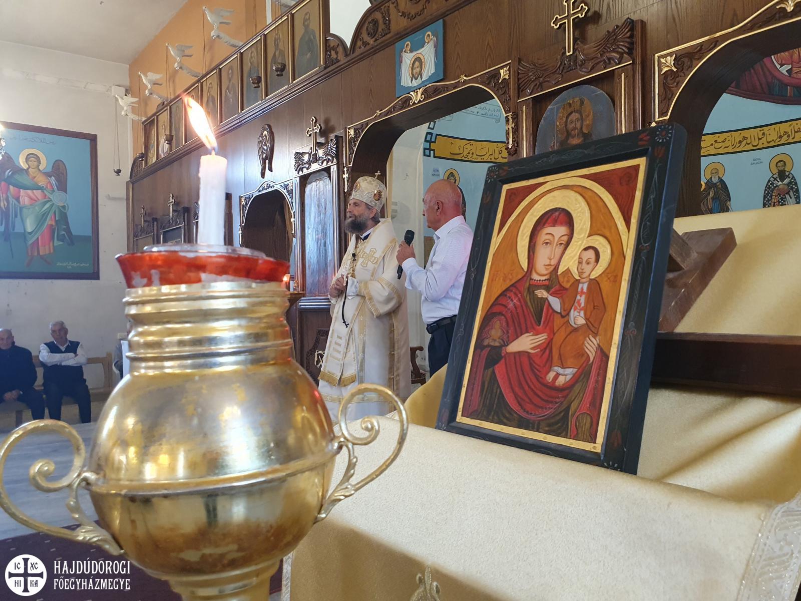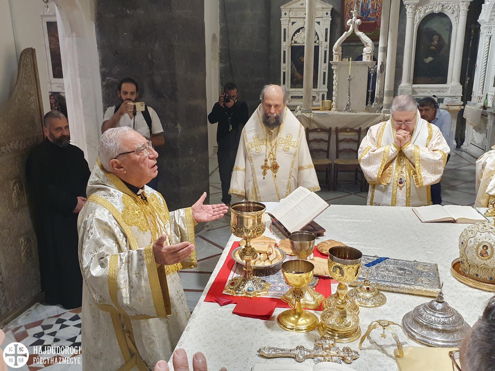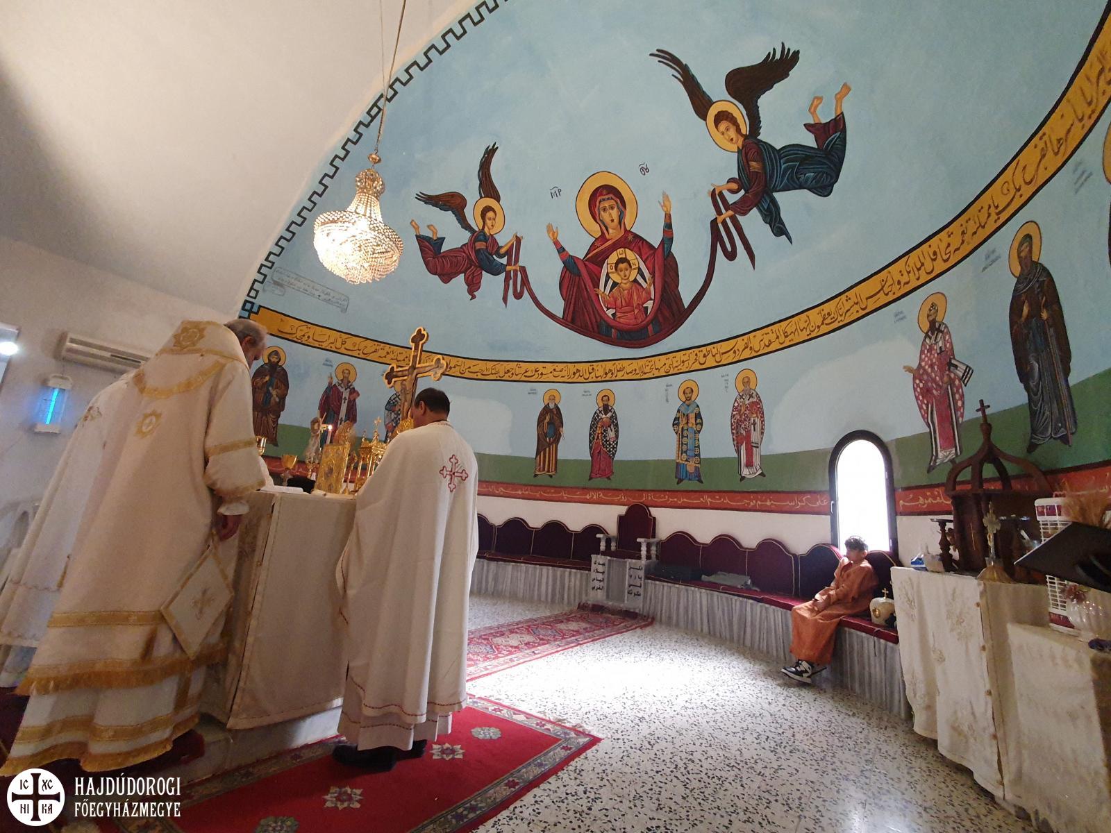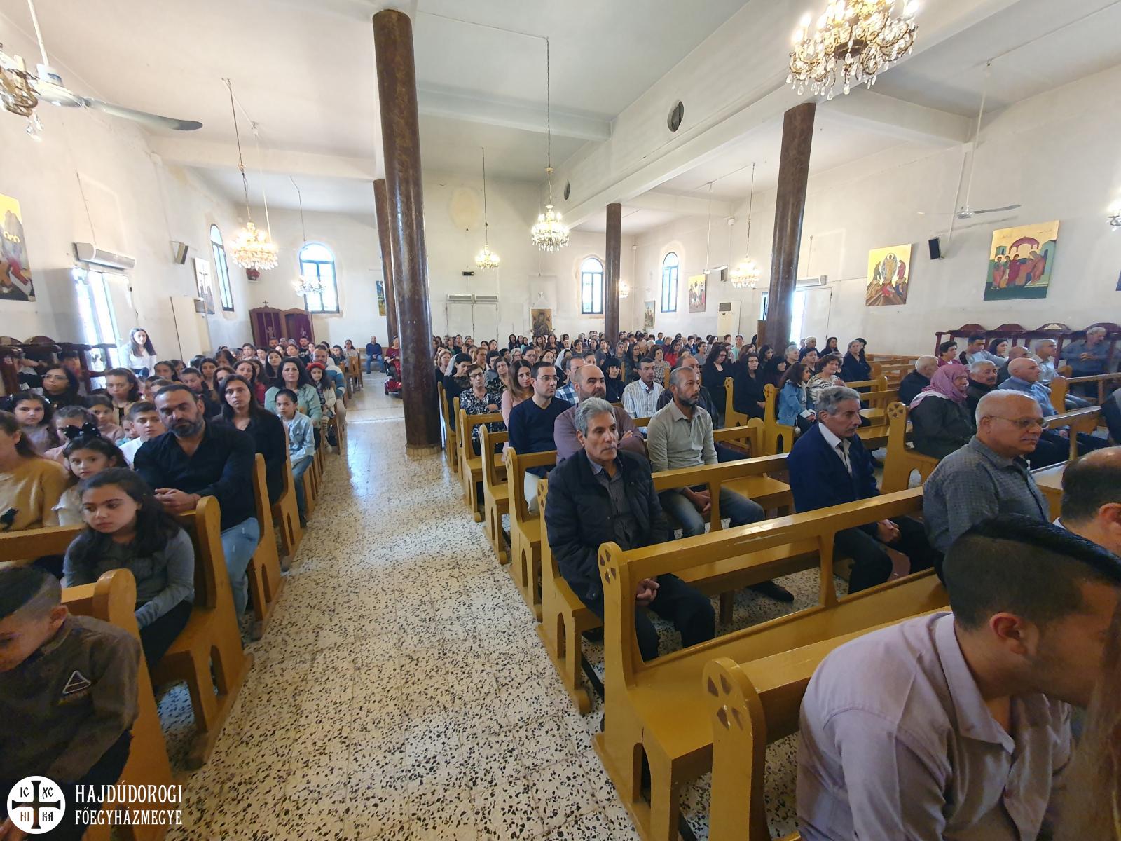 A magyar görögkatolikus főpásztor szíriai látogatásának negyedik, egyben utolsó napján reggel Al-Dmeine falujában vett részt Szent Liturgián. Látogatását megtisztelte Jean-Abdo Arbach homszi püspök is, a kis településen így két püspök és három pap végezte a Szent Liturgiát. Figyelemre méltó, hogy a templom nem csak ilyen ünnepi alkalommal, hanem minden vasárnap tele van, a kórus gyönyörűen énekel. Nekünk különösen is szívet melengető, hogy az ikonosztáz előtt a máriapócsi Istenszülő ikonja is látható.