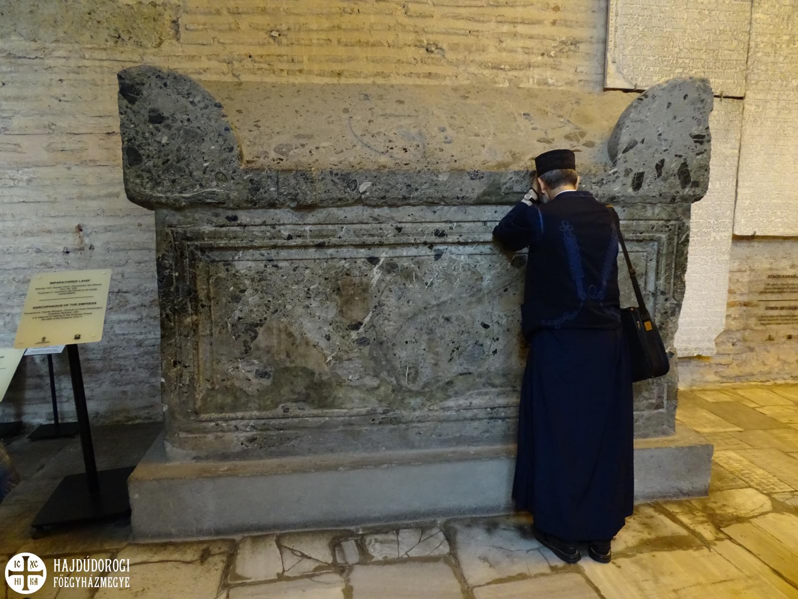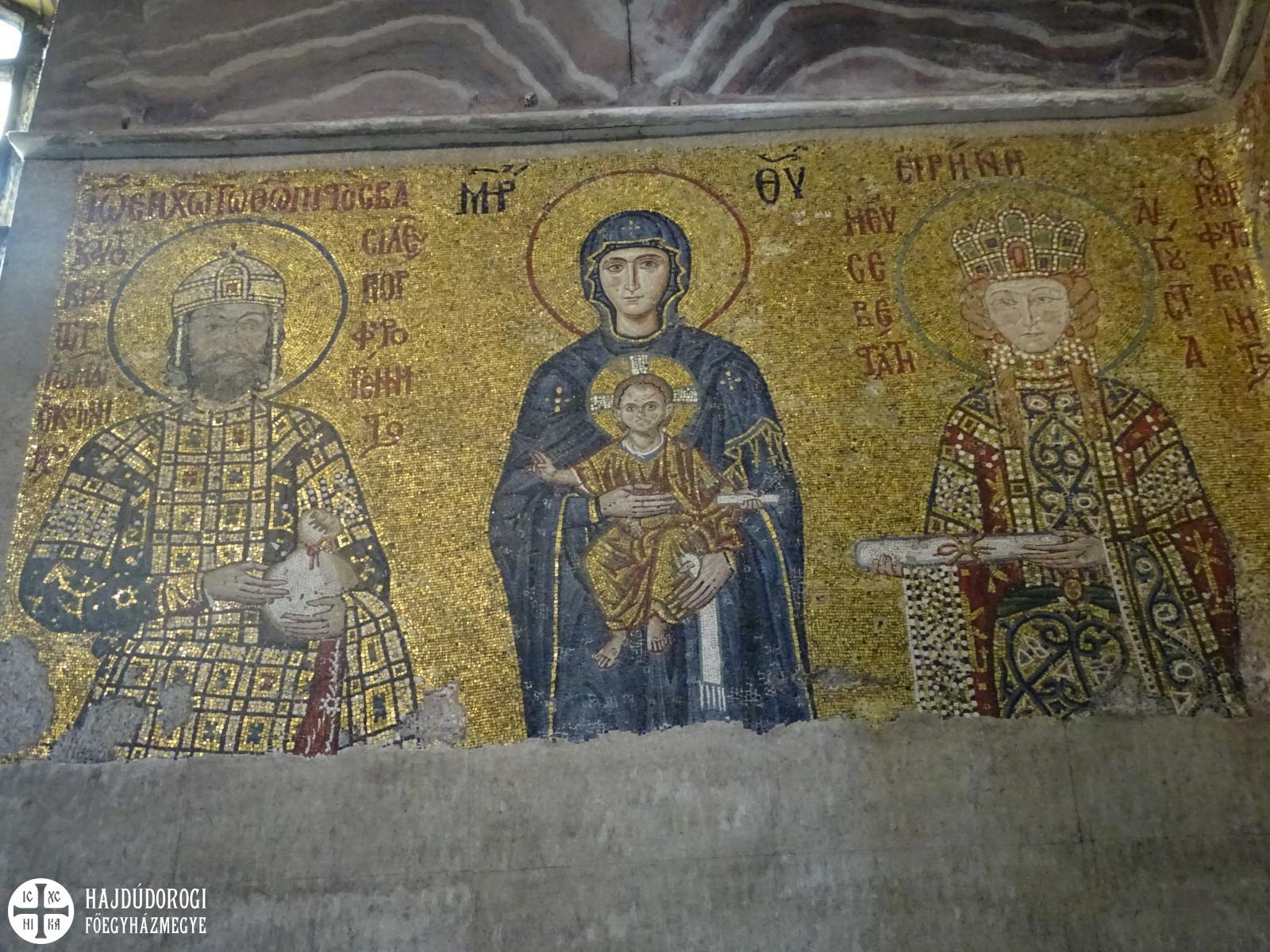 Ezután az 537-ben épült Hagia Sophia következett. A templomhoz közeledve fokozatosan tárult elénk monumentális mérete. Belépéskor ezerötszáz éves Krisztus-mozaikok ejtettek ámulatba, és a számunkra legkedvesebb látnivaló: Szent Piroska, vagyis Eiréné császárné szarkofágja. Piroska Szent László királyunk lánya, Komnénosz Joannész császár felesége volt, a mai napig a legnagyobb tiszteletnek örvendő bizánci császárné. Számos templomot, monostort, kórházat építtetett. Egyetlen Árpád-házi királyi sarj, akinek még életéből maradt ránk portréja: a templom emeletén férjével látható egy arany mozaikon, melyen a Szűzanya ölében ülő Krisztusnak adnak át bőkezű adományokat.