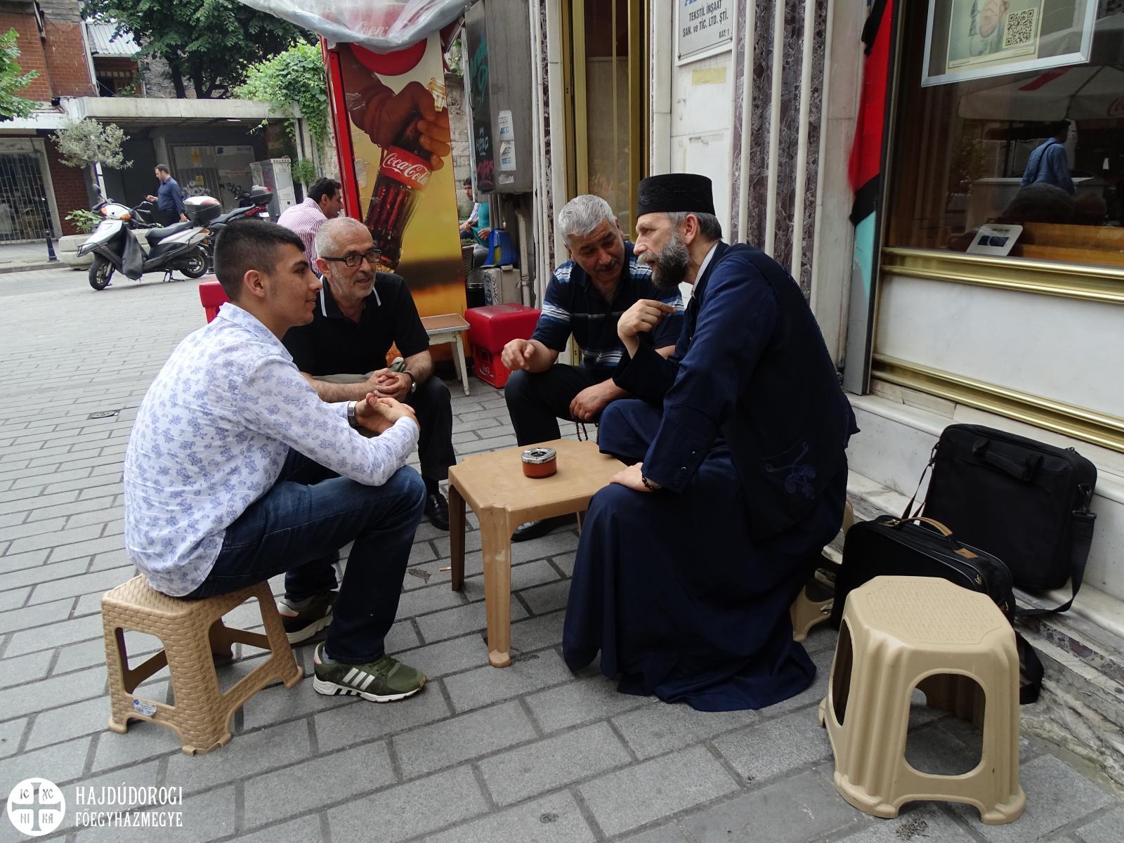 Galata városrészben egy szűk, nem éppen szép sikátor leharcolt sufnijában török kávézót véltünk fölfedezni, ezt pedig ki kellet próbálni Isztambulban. Az előtte üldögélő borostás öregek ezt látva azonnal hellyel kínáltak bennünket, leültettek kis asztalukhoz, néhány újabb öreg érkezése után pedig barátságos beszélgetésbe elegyedtünk velük az itteni életről, az iszlámról, kereszténységről, Magyarországról, Puskásról. Mint kiderült, kurdok voltak és nagyon nagyra értékelték, hogy az Iszlám Állam által meggyalázott keresztényeknek viszünk adományt. A sűrű török kávét természetesen nem engedték kifizetni, és baráti kézfogások közepette búcsúztak el tőlünk. Megható ez a balkáni vendégszeretet.