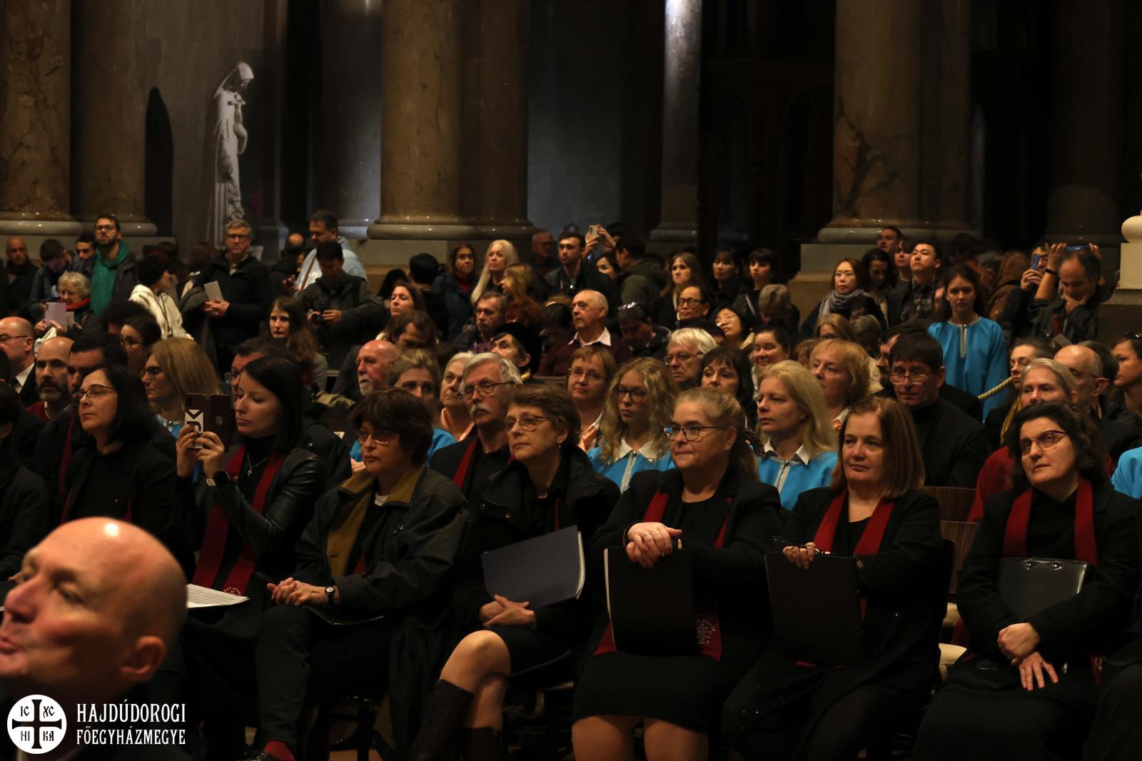 “Kívánom, hogy ez a mai együttlétünk fokozza a hűségünket azon Jézus Krisztus irányába, aki a Jelenések könyve szerint a hű tanú, és annyit kér közösségeitől, hogy légy hű mindhalálig. Az egyik Szent Páltól ránk maradt legutolsó levélben, amit Timóteushoz írt, megkapjuk ezt a nagyon fontos biztatást: ha vele együtt meghalunk, vele együtt élni is fogunk, ha vele együtt szenvedünk, vele együtt uralkodni is fogunk, ha megtagadjuk őt, Ő is megtagad minket, de ha hűtlenek leszünk, Ő hű marad, mert önmagát meg nem tagadhatja. Ezt a Megváltó Krisztust köszöntjük itt ma a Szent István Bazilikában”- adta át ezzel a szót a kóruséneklésnek a miskolci püspökatya.