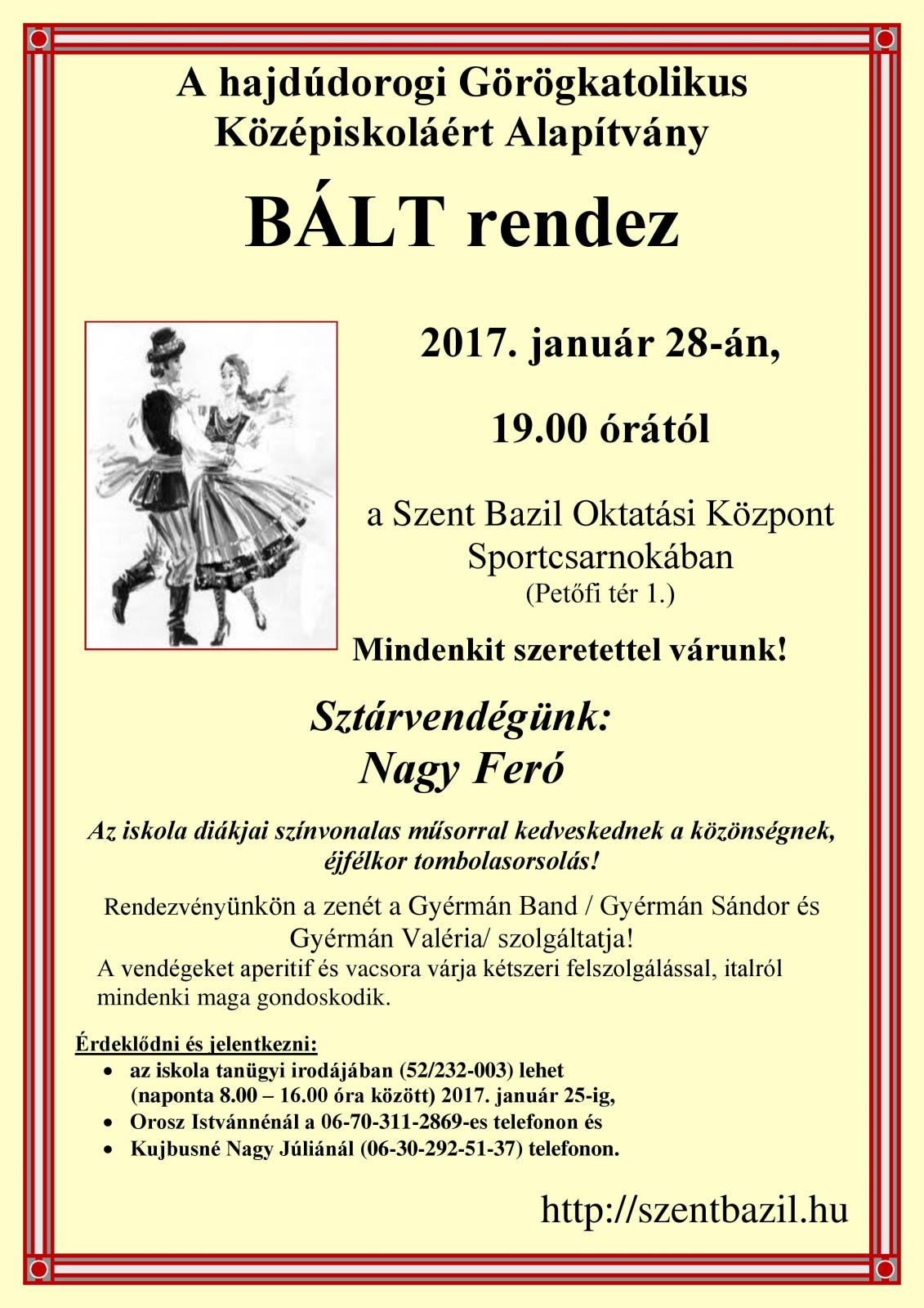 2017. január 28-án rendezik meg Hajdúdorogon a Görögkatolikus Középiskoláért Alapítvány bálját. A sztárvendég: Nagy Feró énekes lesz.