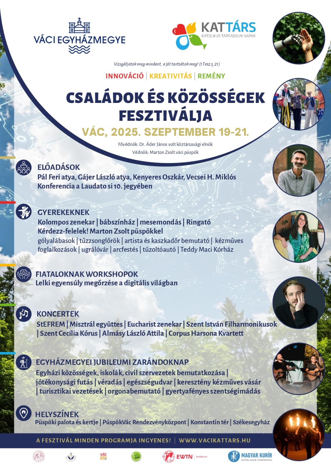 A CSALÁDOK ÉS KÖZÖSSÉGEK FESZTIVÁL hivatalos megnyitója szeptember 19-én délután lesz, amelyen fellép a Magyar Honvédség Központi Fúvós Zenekara és a váci székesegyház Szent Cecília Kórusa. Szeptember 20-án szombaton a család minden tagja megtalálhatja a neki szóló programokat: A gyerekeket kézműves foglalkozások, népi fajátékok, arcfestés, ugrálóvár, óriáscsúszda, tűzoltóautó, focibemutató, zsonglőrködés, állatsimogató és múzeumpedagógiai foglalkozások, Ringató foglalkozás, bábelőadás, színpadi produkciók, mesemondás várja. Panna fociban és csocsóban is összemérhetik tudásukat – ez utóbbiban kispapokkal! A gyerekek személyesen találkozhatnak Marton Zsolt püspökkel és kérdezhetik őt! 15 órától a székesegyházban megismerkedhetnek az orgona működésével. Délután a Kolompos együttes koncertje zárja a napot a gyerekeknek.