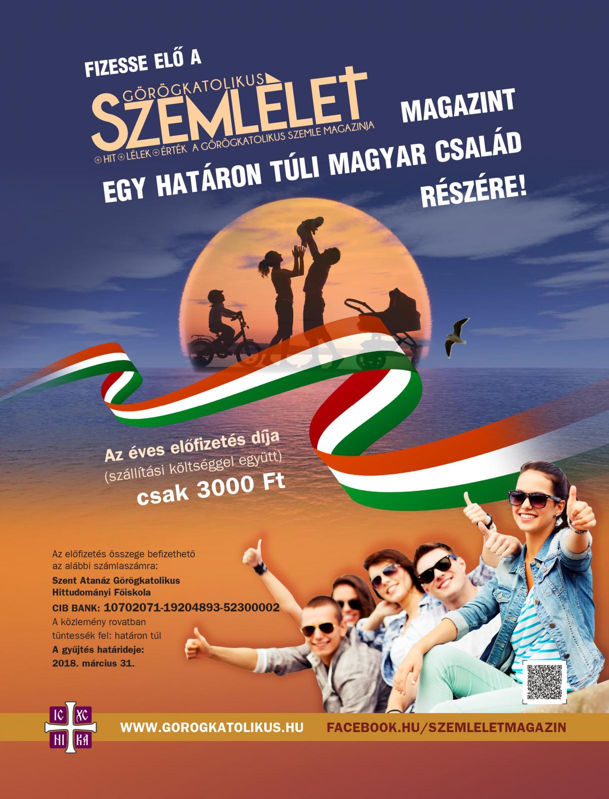 Az elmúlt esztendőkben egyre több igény mutatkozott a Görögkatolikus Szemlélet Magazin olvasására az elszakított területeken élő magyar görögkatolikus testvéreinktől is, ezért 2018-tól a Metropólia területén kívül is kapható lesz magazinunk – tavaly már hetven új előfizetést jegyeztünk Szatmárnémeti környékéről. Bizonyára mindannyiunk előtt ismert tény, hogy főleg Kárpátalján, de több határon túli területen is gyakran igen nehéz körülmények között élnek testvéreink, ezért úgy döntöttünk, hogy a szokásos segélyszállítmányok mellett összetartozásunk és szolidaritásunk jeléül újfajta akciót indítunk: arra buzdítjuk híveinket, hogy fizessék elő egy évre a Görögkatolikus Szemlélet Magazint egy határon túli magyar család számára. Az éves előfizetés a postai költségekkel együtt csak 3000 Ft, mely egy évre elenyésző összeg, az evvel nyújtott élmény, a törődés, az összetartozás érzése viszont pénzben nem kifejezhető értékek. Határainkat, egyházmegyéinket noha szétszakították, bennünket egymástól nem lehet elválasztani. Ezt hivatott kifejezni ez a gesztus is, amire hívjuk a görögkatolikus híveket.
