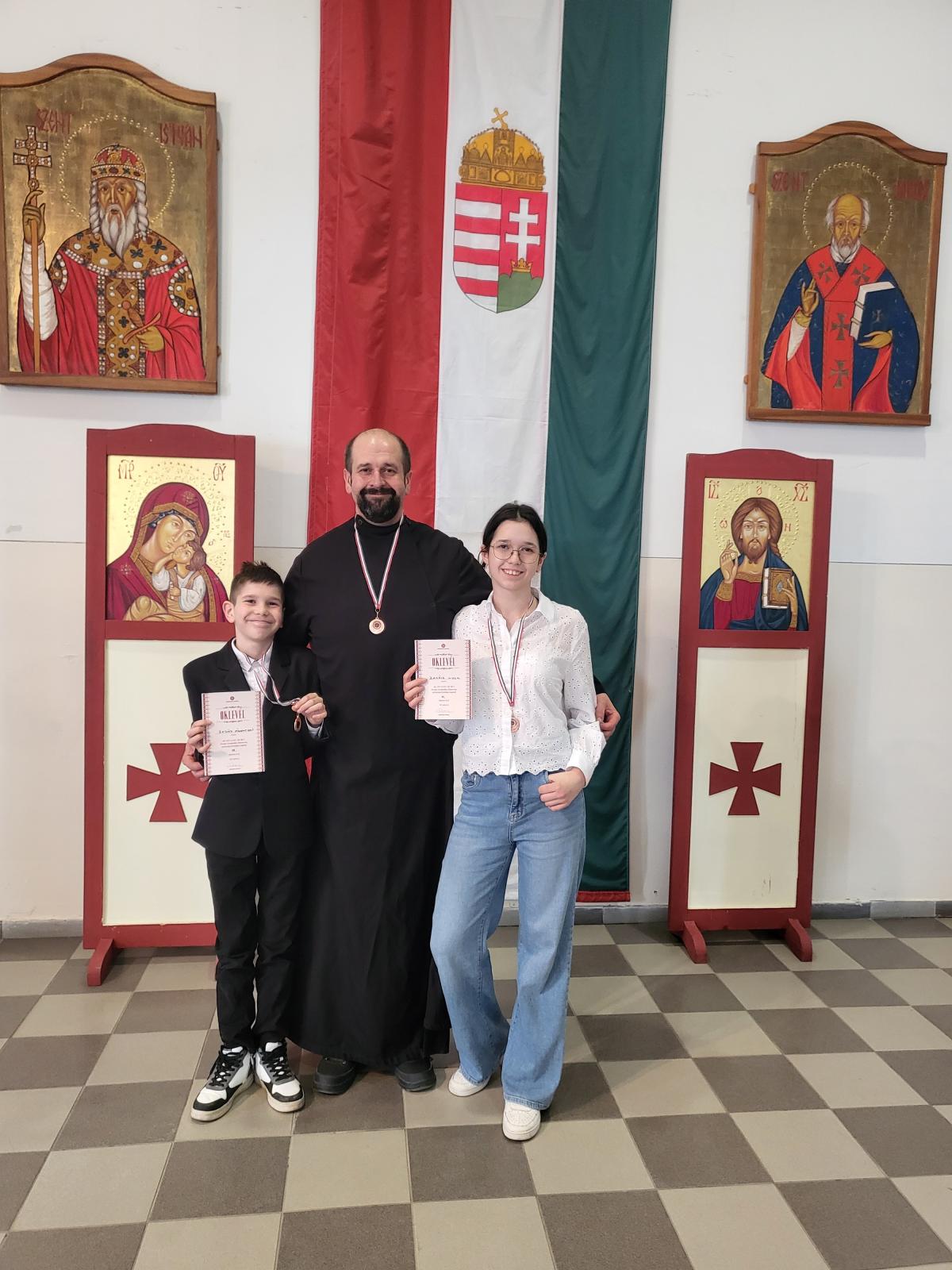 Picit hátrányos helyzetből indultunk most az egyházmegyei versenyen, mert az egyik társunk egy budapesti országos csapatversenyen vett részt az iskolájával, így az ő tananyagrészét is meg kellett tanulnunk az öcsémmel. Kettőnk tudása most a 3. helyezéshez segített hozzá, így megyünk március 21-én Máriapócsra az országos megmérettetésre.