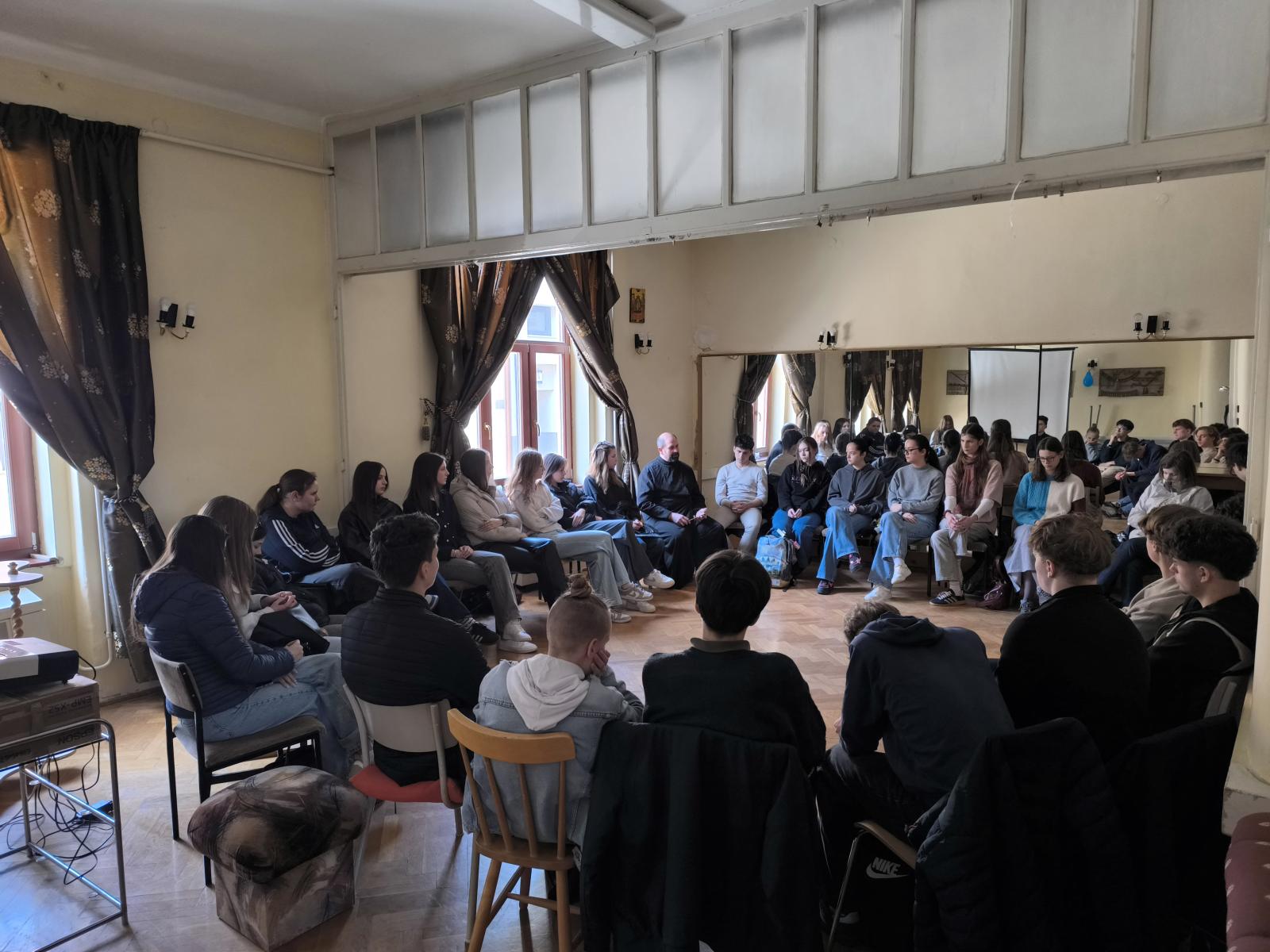 A márciusi program szentmisével indult, majd a diákok a pécsi Xavéri Szent Ferenc Görögkatolikus templomba látogattak, ahol közös imádság után a görögkatolikus hagyományokról beszélgettek. A nap a közösségi házban folytatódott, ahol egy, a húsvéti témához kapcsolódó, népszerű filmsorozat epizódját tekintették meg.