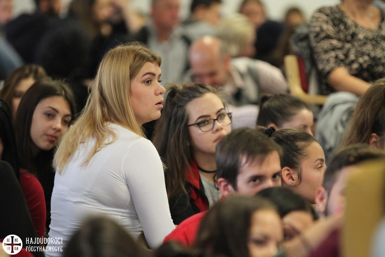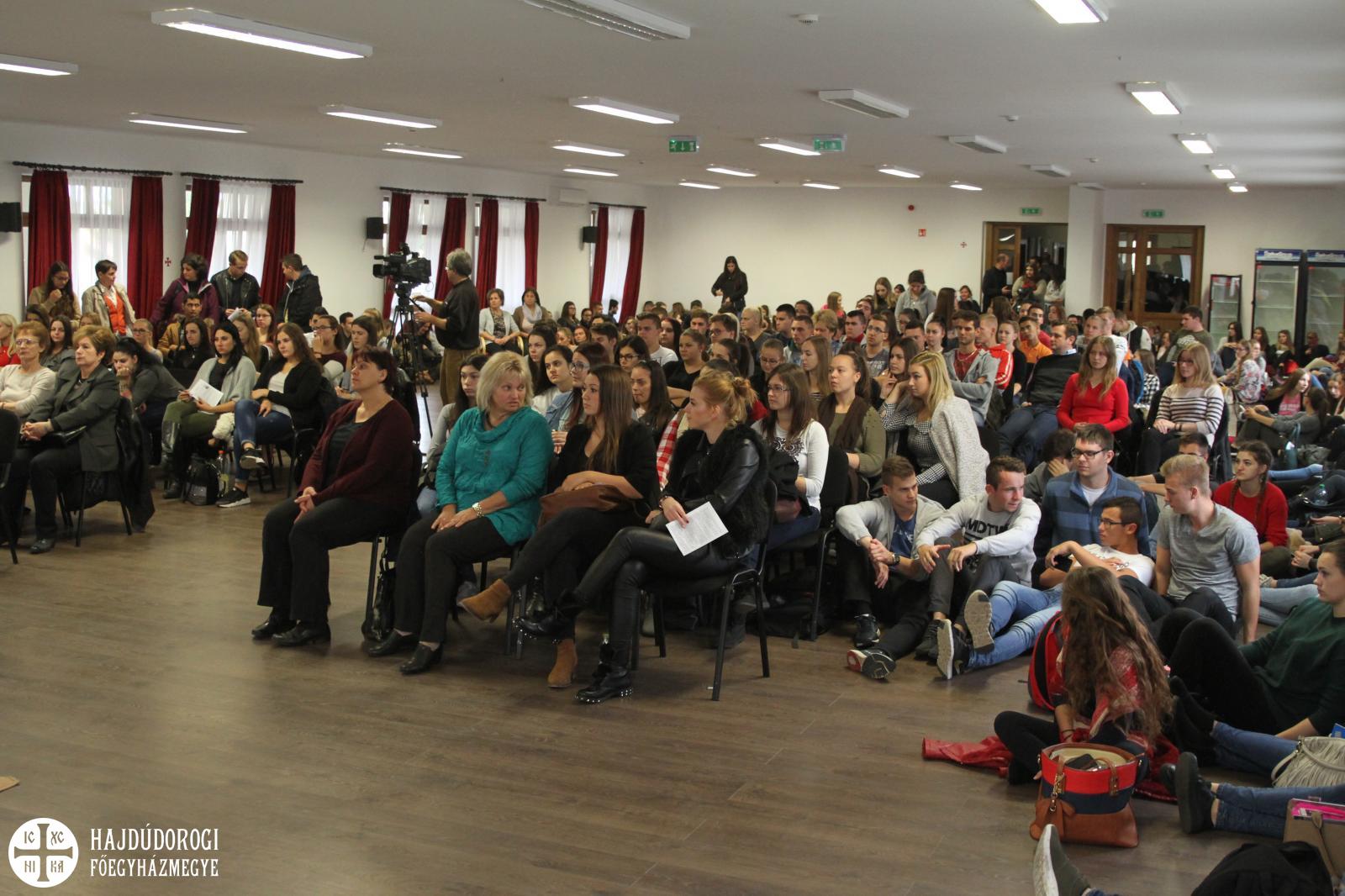 A fiatalok a regisztráció során ajándékot is kaptak a szervezőktől, lelkesen csatolták fel az új, Metropóliás kulcstartójukat a meglévők mellé. Kezdésként az Emmánuel Zarándokház emeleti előadójában köszöntötte őket dr. Seszták István, főhelynök atya, aki bíztatta őket, hogy nyitott szívvel vegyenek részt a mai napon. Mint mondta: „a mai zarándoklatnak az elsődleges célja, hogy a görögkatolikus intézményeinkben az érettségi előtt álló fiatalokat kicsit közelebb hozzuk egymáshoz. És persze itt Máriapócson a jó Istenhez is.