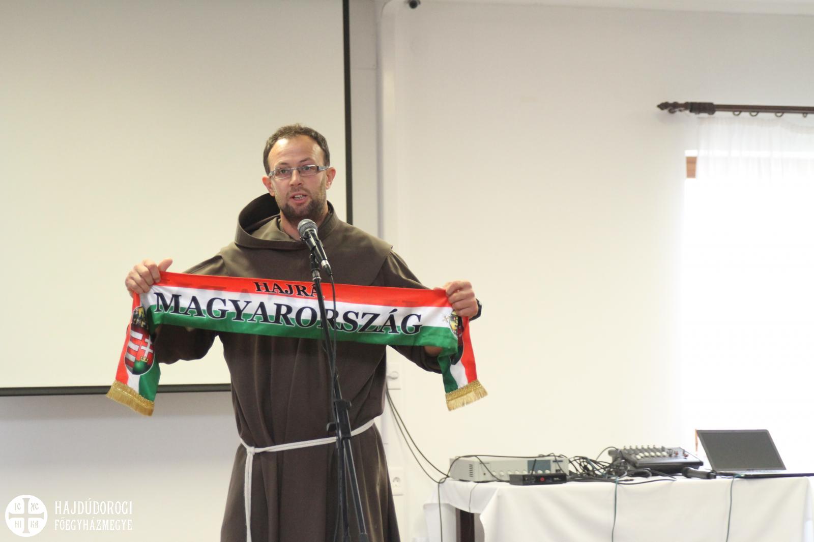 A nyitóelőadást Rockenbauer Barnabás, ferences testvér tartotta. Egyfajta tanúságtételt hallhattak tőle a fiatalok: sajátos előadásban. Mint említette: lételeme a foci, a sport és a ló, lovaglás. Mesélte, hogy beleszületett ebbe a dologba, édesanyja futballszerető asszony volt mindig is. Gyerekkorában ő volt a falu focicsapatának szertárosa. Vasárnaponként korán felkeltek, feltették az ebédet, elmentek a misére, majd ki a futballpályára. Felraktuk a hálót, becsíkoztuk a pályát, kikészítettük a mezeket. Ezután hazamentek ebédelni, majd pedig vissza a meccsre. Amikor véget ért a találkozó, visszapakolták a szereket, és kimosták a mezeket. Ezt látta, ebben nőtt fel, de meghatározó élmény volt az is, hogy kissrácként csapatokba verődve jártak focizni a falu szélére.