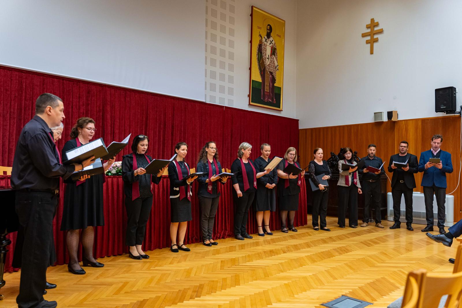 Az egyéni műsorszámok mellett a vizsgakoncert elején a Szent Atanáz kórus megörvendeztette a közönséget Boksay János 1901-ben írt Aranyszájú Szent János liturgiájának Teljenek be ajkaink... tételével.