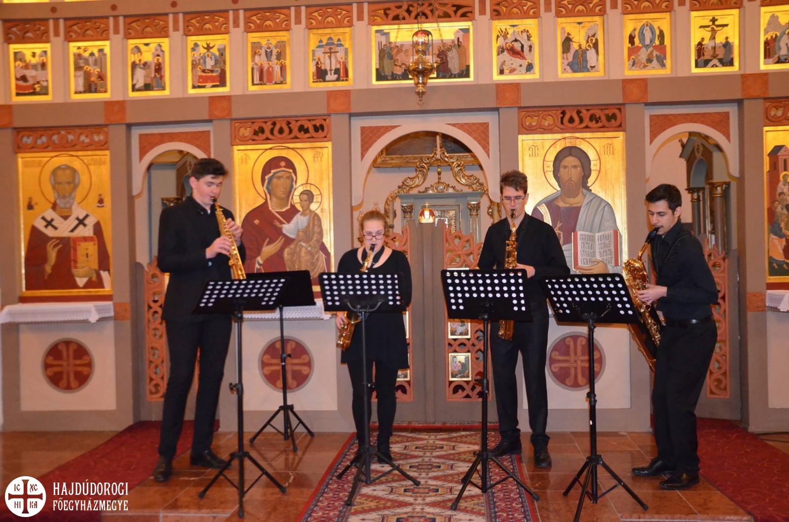A Kodály Zoltán Zeneművészeti Szakgimnázium szaxofon kvartettje, Bencze Mátéval az élen. Páratlan zenei élményt nyújtottak.