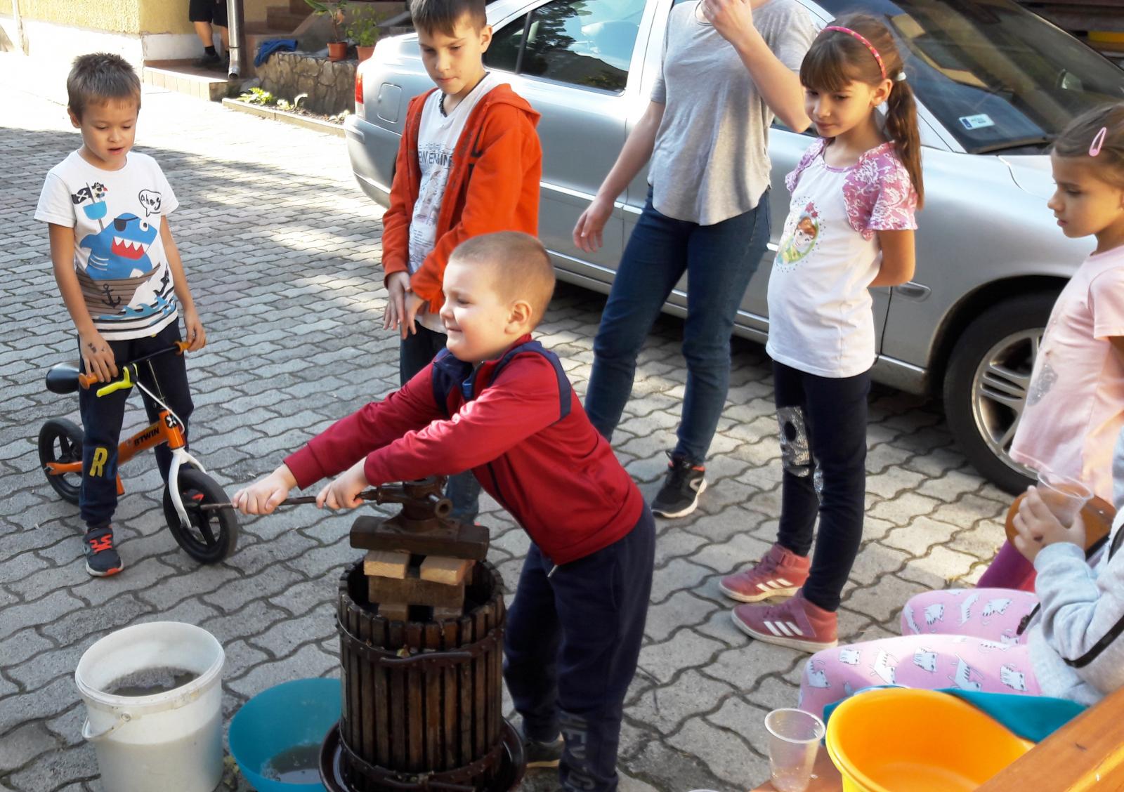 Közben az udvaron már készült a finom must, a préselésben a gyermekek is örömmel segédkeztek.