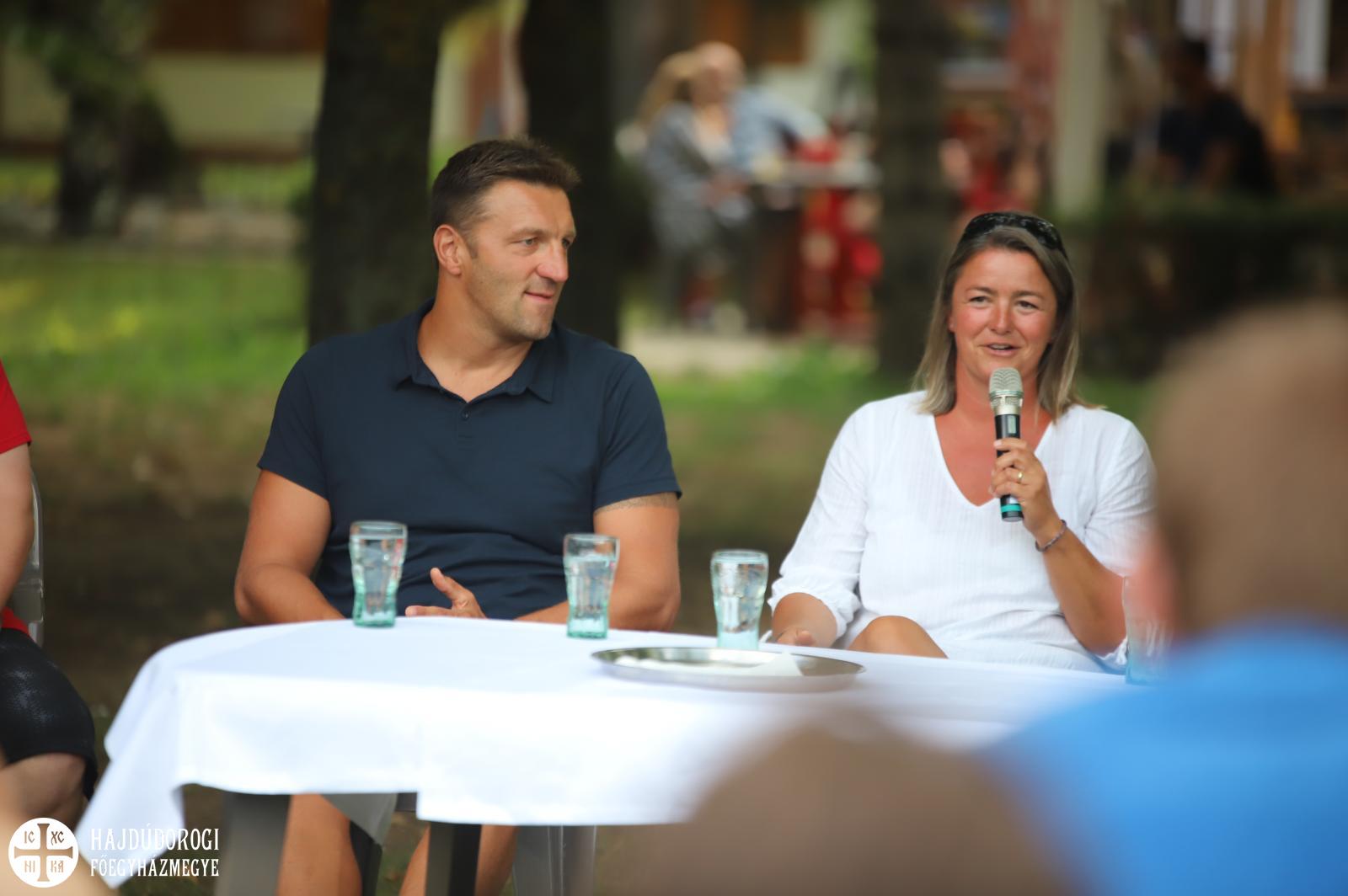 A strand focipályája aztán nézőtérré alakult át, ugyanis itt hallgathatták végig a sportolóházaspár „sikersztoriját” a fiatalok. Talán nem túlzás Kiss Gergelyék történetét így nevezni, hiszen nemcsak a karrier, de a magánélet terén is olyan követendő példa az övék, amely ma már igen ritka. A házaspárt Obbágy Lacus atya kérdezte 22 éve töretlen szövetségükről, gyereknevelésről, sportolói örömökről, nehézségekről. Gergely és Anna is nagyon közvetlenül, szívesen felelt minden kérdésre.