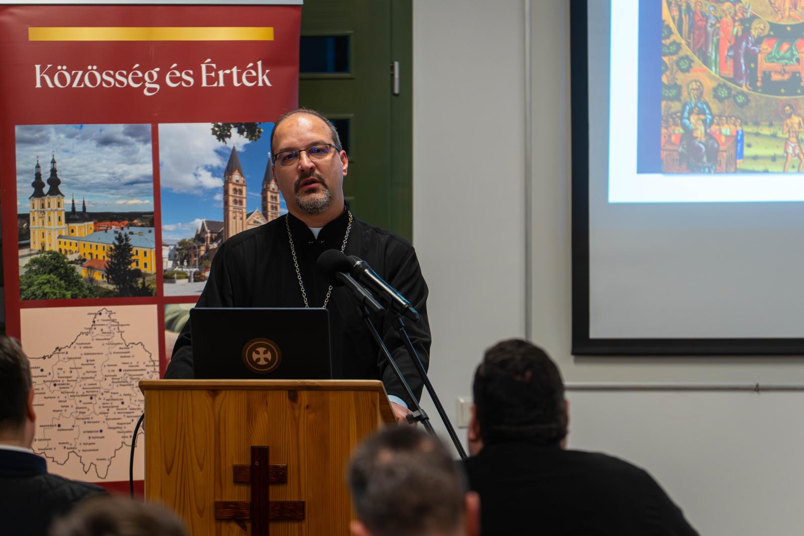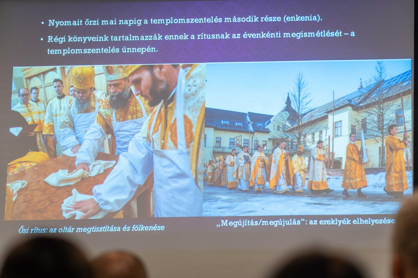 Dobos András teológus, főiskolai tanár a bizánci egyház ereklyetiszteletéről beszélt. Mint elmondta, a nyugati egyházban ereklyének nevezik a szentek ruháit vagy a hozzájuk kapcsolható tárgyi emlékeit is, a keleti egyházban azonban a szentek testi maradványait tekintjük ereklyének. Régészeti és írásos bizonyítékok szerint a szentek földi maradványainak tisztelete már az első századokban megjelent. A kereszténység szabaddá válását követően a vértanúk sírjai fölé martyriumokat, mauzóleumokat emeltek. A sírokat gyakran fölnyitották, a maradványokat új, nagyobb templomokba vitték. Az újbóli keresztényüldözések során, amikor tiltva lett a szentek sírjainak látogatása, gyakran magukkal vitték a szentek csontjait a keresztények, hogy erőt merítsenek belőlük, és megóvják a pusztítástól.