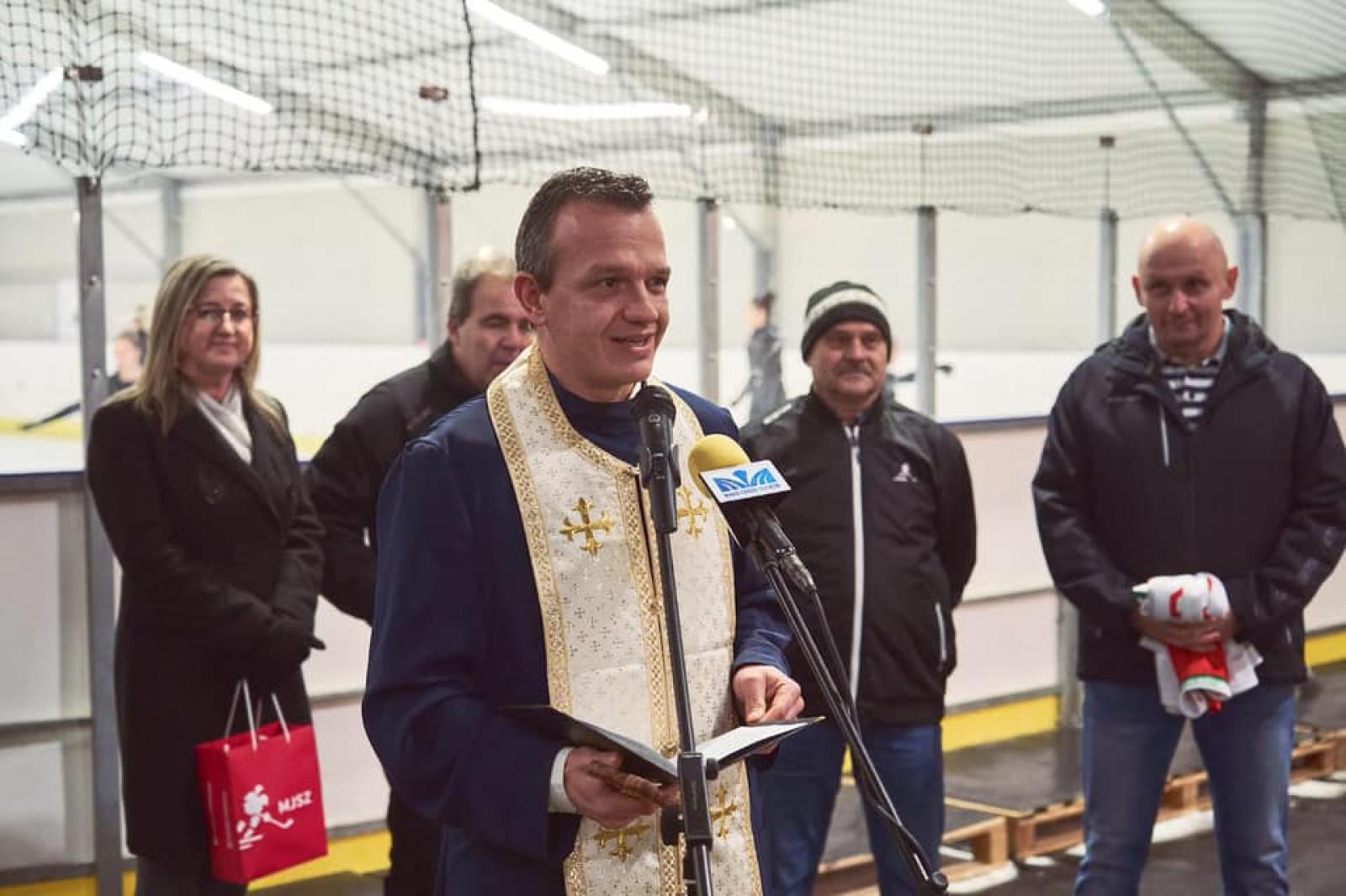 Biró István parókus atya pedig rendhagyó módon: korcsolyán állva áldott meg az új funkciókkal ellátott pályát.