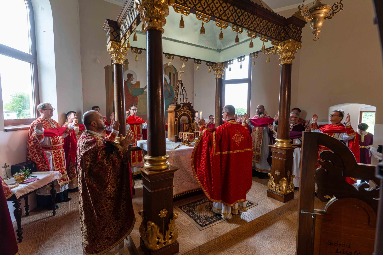 A tíz órakor kezdődő ünnepi Szent Liturgia – Zoltán György fődiakónus atya diakonizálásával – két nyelven zajlott: a magyar mellett egyházi szláv nyelven is felcsendültek könyörgések, imák. A szertartást házigazdaként Szabó Tamás pasztorális helynök atya celebrálta, de az oltár körül mintegy tizenöt paptestvér és bazilita szerzetes szolgált még.