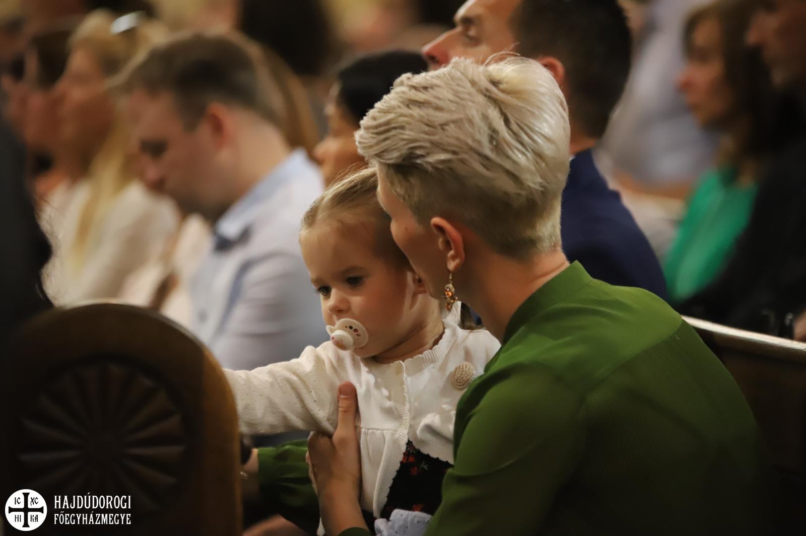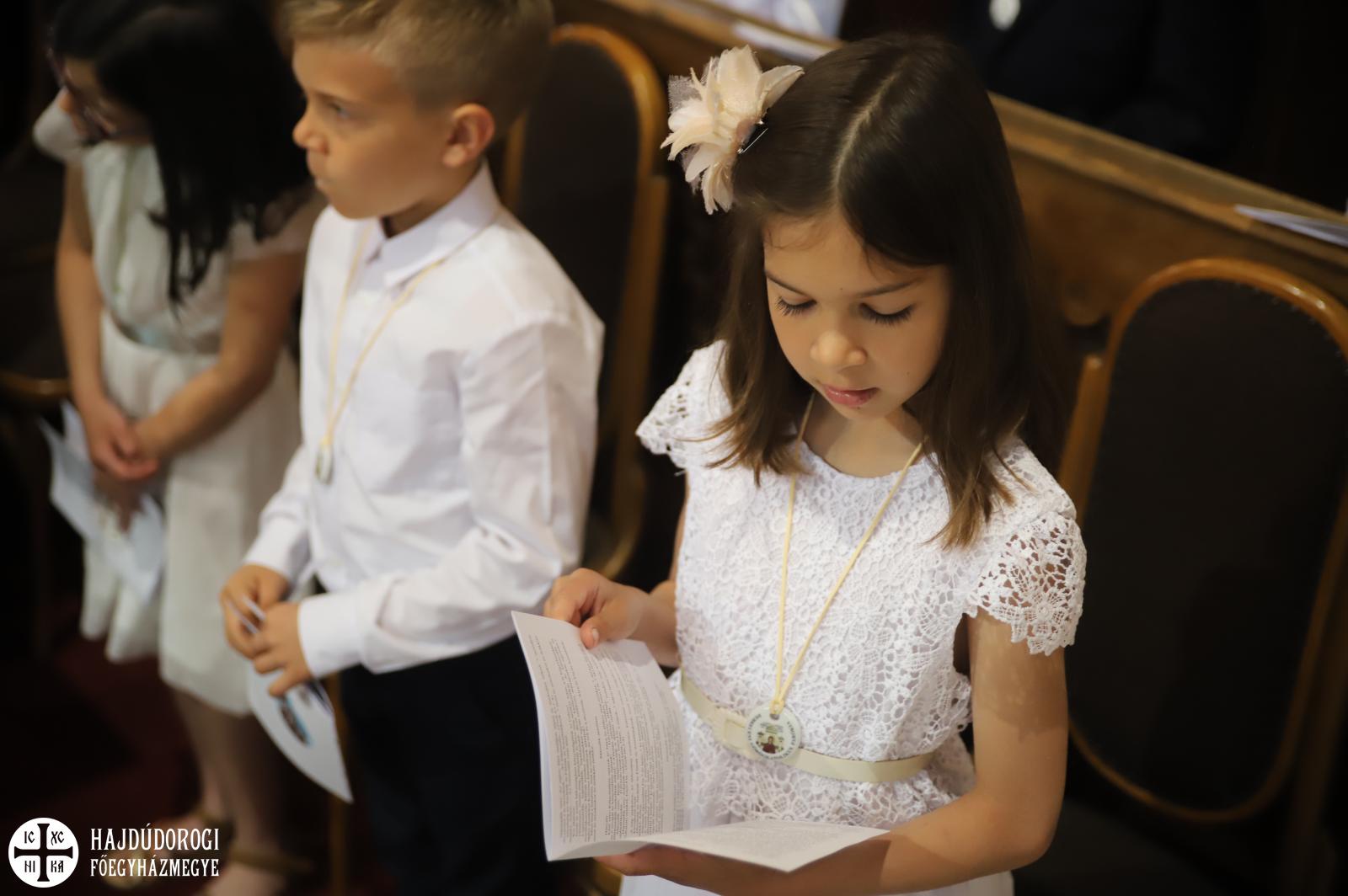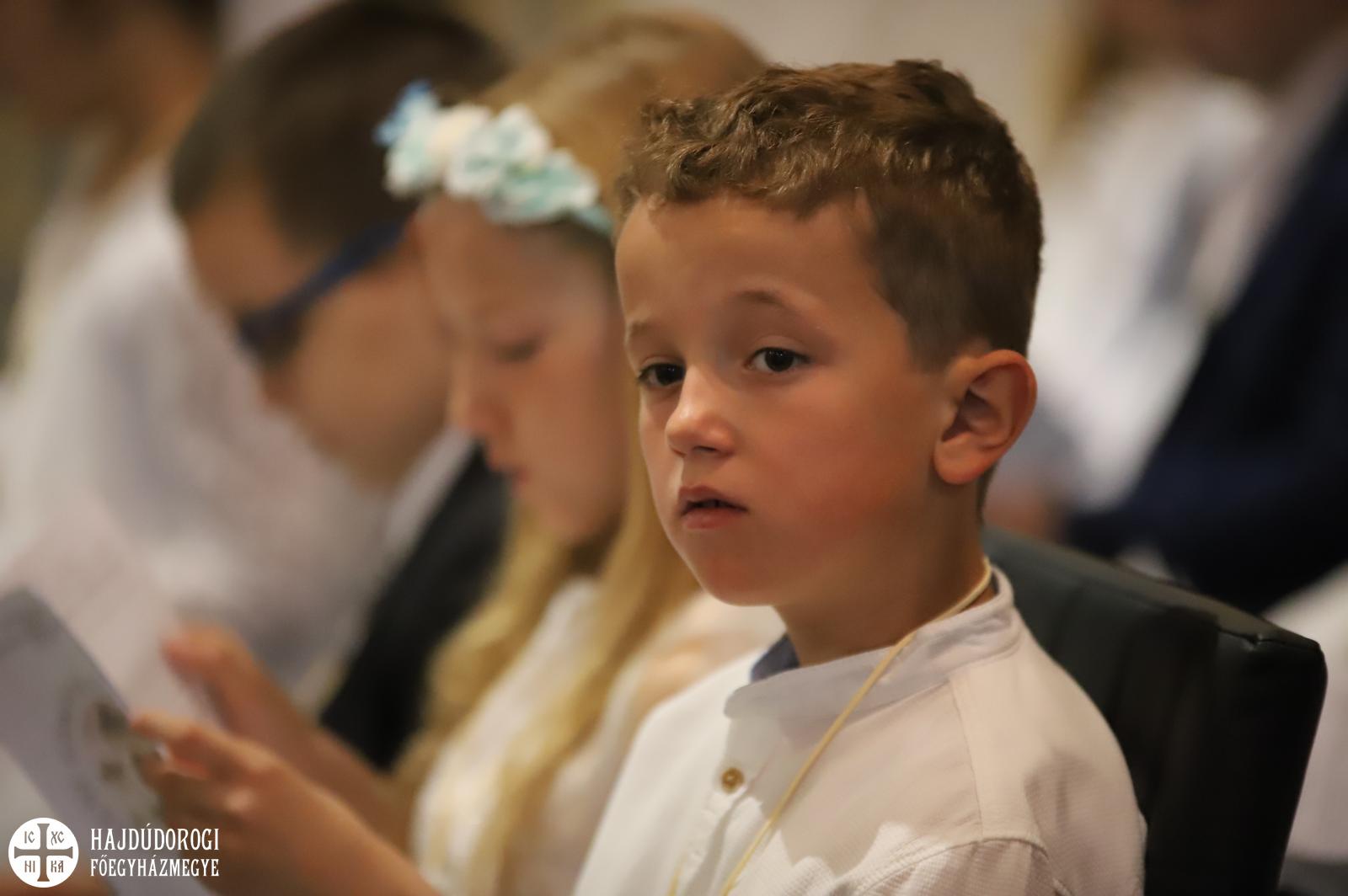 – Mindnyájan vakon születünk, órák, sőt, sokszor napok telnek el, mire elkezdünk fényeket, foltokat észlelni. Úgy, ahogyan a kezdetekben még csak foltokat, majd alakokat látunk, a lelki látásunk is fokozatosan lesz egyre erősebb, tisztább. Csak az utóbbihoz sokkal több idő szükséges. Hosszú évek kellenek ahhoz, hogy megismerjük Jézust. Most, amikor itt vagytok az elsőáldozáson: vajon többet tudtok-e a Mindenhatóról? – szólt a kicsikhez a főpásztor, majd rögvest válaszolt is: „Remélem!”