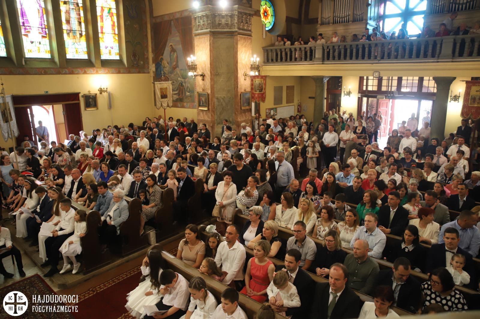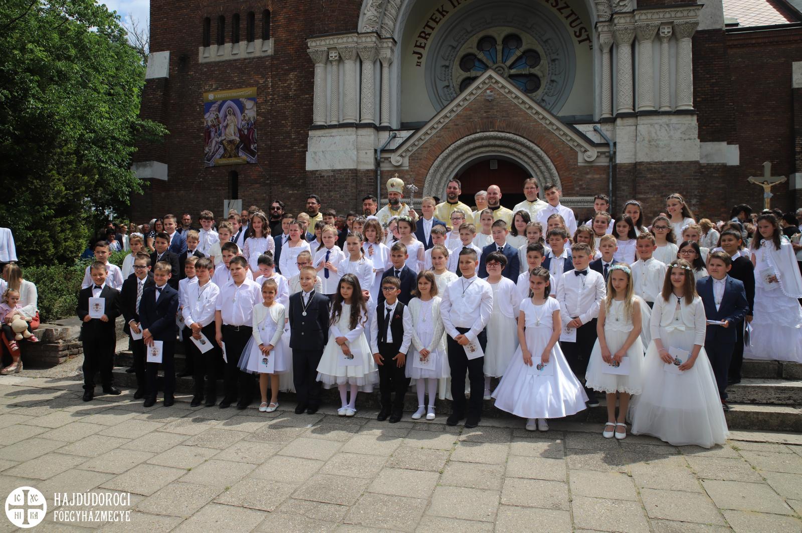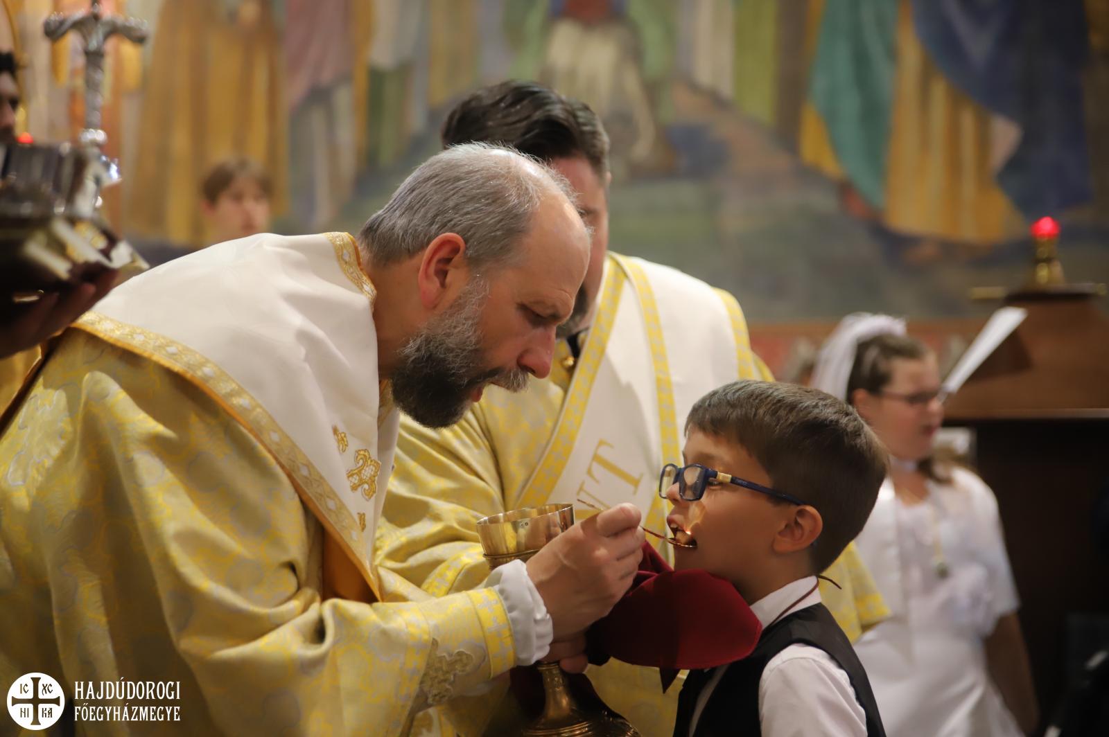 – Mindnyájan vakon születünk, órák, sőt, sokszor napok telnek el, mire elkezdünk fényeket, foltokat észlelni. Úgy, ahogyan a kezdetekben még csak foltokat, majd alakokat látunk, a lelki látásunk is fokozatosan lesz egyre erősebb, tisztább. Csak az utóbbihoz sokkal több idő szükséges. Hosszú évek kellenek ahhoz, hogy megismerjük Jézust. Most, amikor itt vagytok az elsőáldozáson: vajon többet tudtok-e a Mindenhatóról? – szólt a kicsikhez a főpásztor, majd rögvest válaszolt is: „Remélem!”