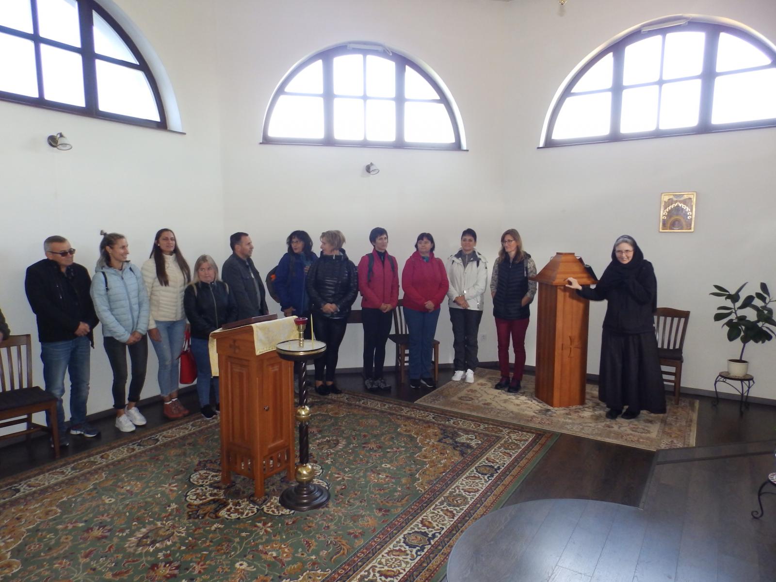 Ezután két csoportra osztva meglátogathattuk a monostorban élő szerzetesnővéreket. Többségünknek korábban csak kívülről volt lehetősége megtekinteni otthonukat, így most nagy várakozással sétáltunk át a gyönyörű levendulabokrok között, hogy belülről is láthassuk ezt a zárt közösséget. Két nővér mesélt a monostor alapításáról, az itt élők mindennapjairól, majd a csoportokat egyesítve a templomban kérdéseket is tehettünk fel nekik. Kedvesen válaszoltak mindenkinek. Meséltek saját korábbi életükről, motivációikról, jelenlegi életük praktikus mozzanatairól is.