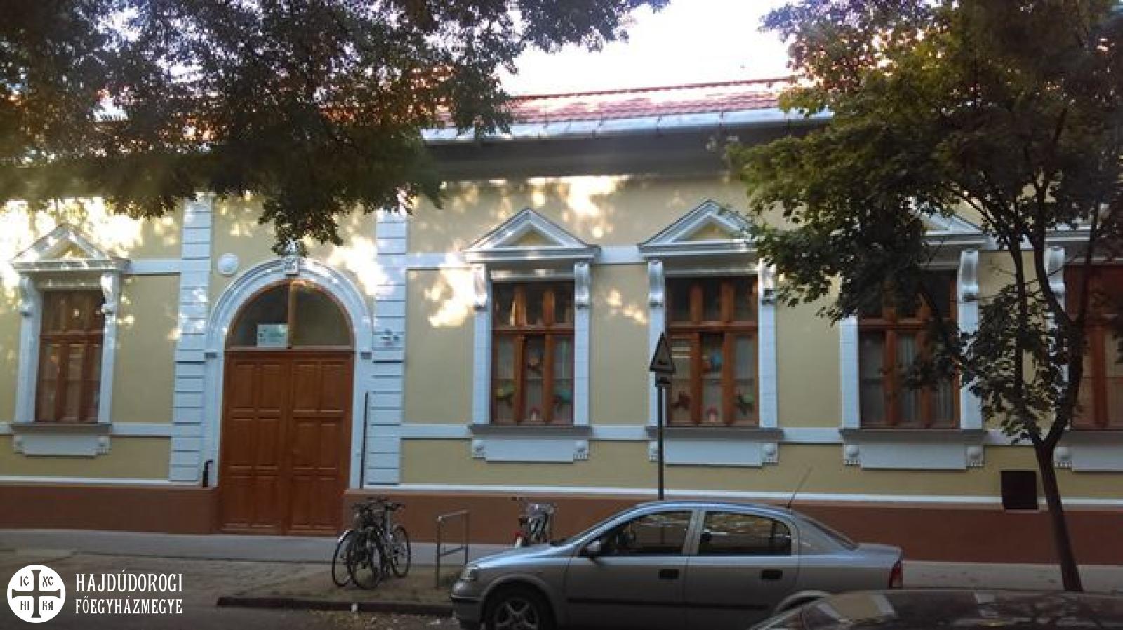 Az óvoda épülete 1910-es években épült, a Vígkedvű Mihály utca egyetlen megmaradt, eredeti homlokzatával rendelkezik. Az átvételkor nagyon rossz műszaki állapotú épületet a Hajdúdorogi Főegyházmegye az évek során részben felújította, alkalmassá téve az óvodai működésnek, azonban az épület átfogó épületenergetikai fejlesztése szükséges volt. Közbeszerzés eredményeként a Mega-Bau 2003 Kft. volt a generálkivitelező. A két ütemben elvégzett felújítás teljes értéke bruttó 146 millió forint volt, melyből bruttó 121 millió forint volt a pályázati forrás, 25 millió forint pedig a fenntartó Hajdúdorogi Főegyházmegye saját forrása. E saját forrásnak köszönhetően a felújítás során számos olyan munkarész is elkészülhetett, amelyre a pályázati forrás nem adott lehetőséget. A beruházás során nagy gondot fektettünk a százesztendős homlokzat felújítására, megtartva annak díszítéseit. Az új homlokzati nyílászárók az eredetivel azonos megjelenésűek, de hőszigetelésük a mai kor követelményeinek is megfelel. Az udvari homlokzatokon külső hőszigetelés is készült. Teljesen új fűtési rendszert kapott az 560 négyzetméter területű intézmény, a megújuló energiahasznosítást pedig a tetőkre telepített 12,5 kWp teljesítményű napelem-rendszer biztosítja. Az önerőből végzett belső felújítási munkák leglátványosabb eleme az a két korszerű mobilfal, amelyek segítségével a három nagy csoportszoba összenyitható egy nagy 140 négyzetméteres térré, hogy elegendő hely legyen az óvoda közösségi rendezvényeinek.