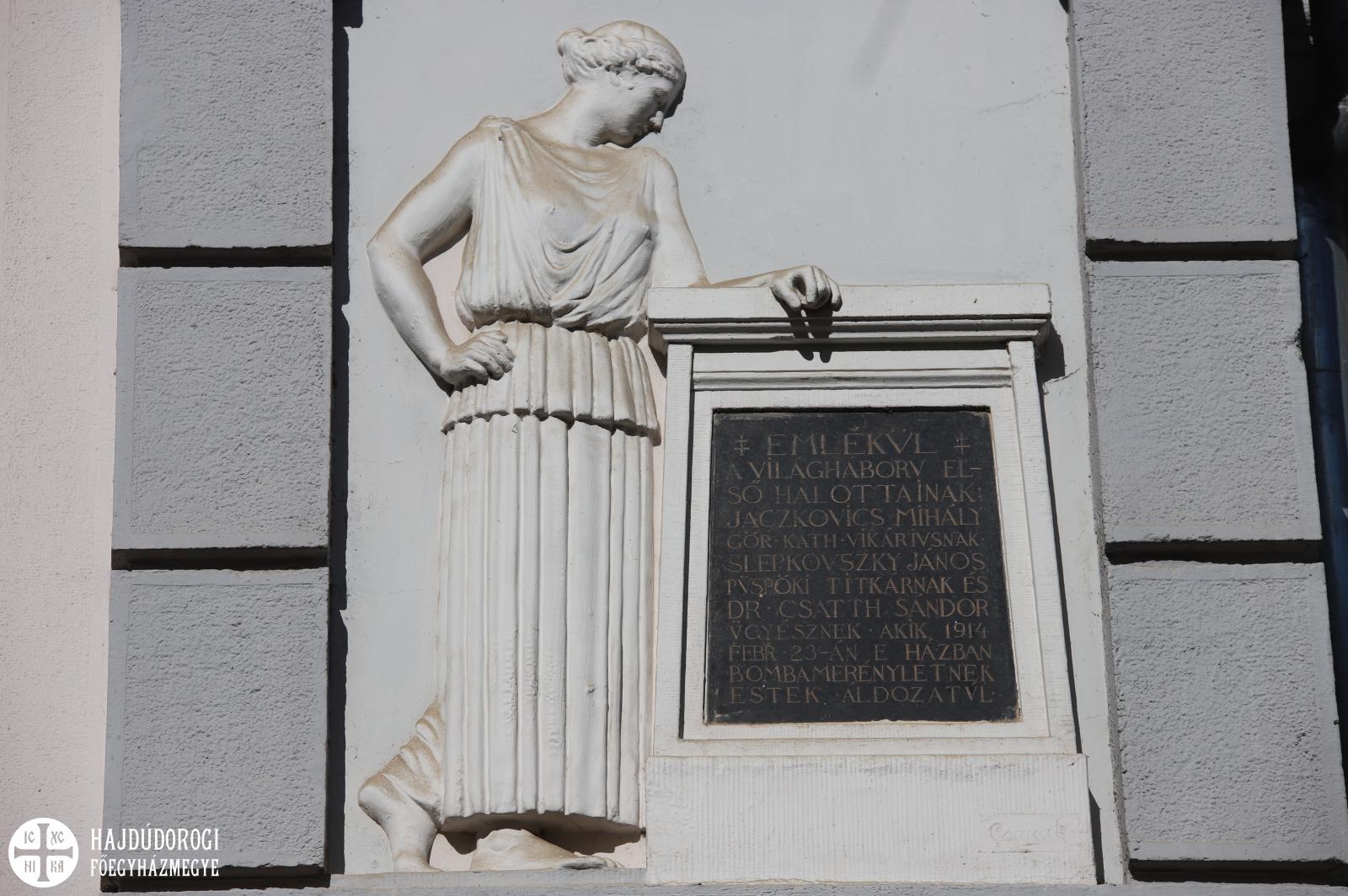 "1914. február 23. napján ellenségtől küldött bomba robbanása ölte meg Jaczkovics Mihály g. kath. vikáriust, Slepkovszky János püspöki titkárt, Dr. Csatth Sándor egyházi ügyészt. A világháború véres viharának első villámcsapása sújtotta le őket, mint a magyar nemzet ügyének hősi halottait. Legyen áldott emlékezetük." - írja az debreceni főszékesegyházban található emléktábla.