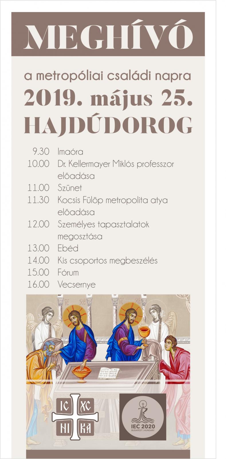 Erre az alkalomra most is minden paptestvért és diakónust kedves feleségével és egész családjával együtt szeretettel várunk, valamint a velük érkező családokat, egyházközségenként kettőt-kettőt. Olyan családokat, házaspárokat hívunk, akikre az atyák később is számíthatnak, egyrészt hogy a Hajdúdorogon elhangzottakról otthon, saját közösségeikben beszámoljanak, másrészt hogy egyházunk további fejlődésének motorjai legyenek.