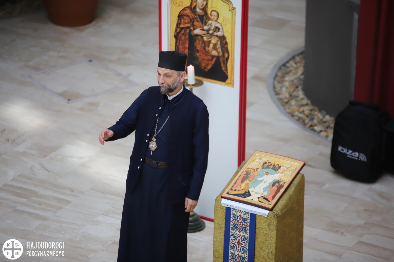 Természetesen az Attila téri Főszékesegyház sem maradhatott ki a látnivalókból, itt közös éneklés után Fülöp metropolita atya elmondta, hogy hamarosan elkezdődik a templom teljes körű felújítása. Nagy öröm számára, hogy a miskolci és nyíregyházi székesegyházak után a debreceni is megszépülhet.