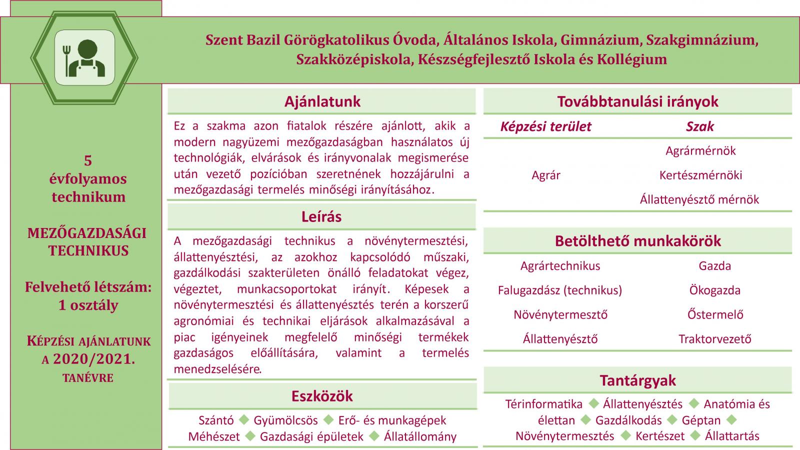 Ez a szakma azon fiatalok részére ajánlott, akik a modern nagyüzemi mezőgazdaságban használatos új technológiák, elvárások és irányvonalak megismerése után vezető pozícióban szeretnének hozzájárulni a mezőgazdasági termelés minőségi irányításához.