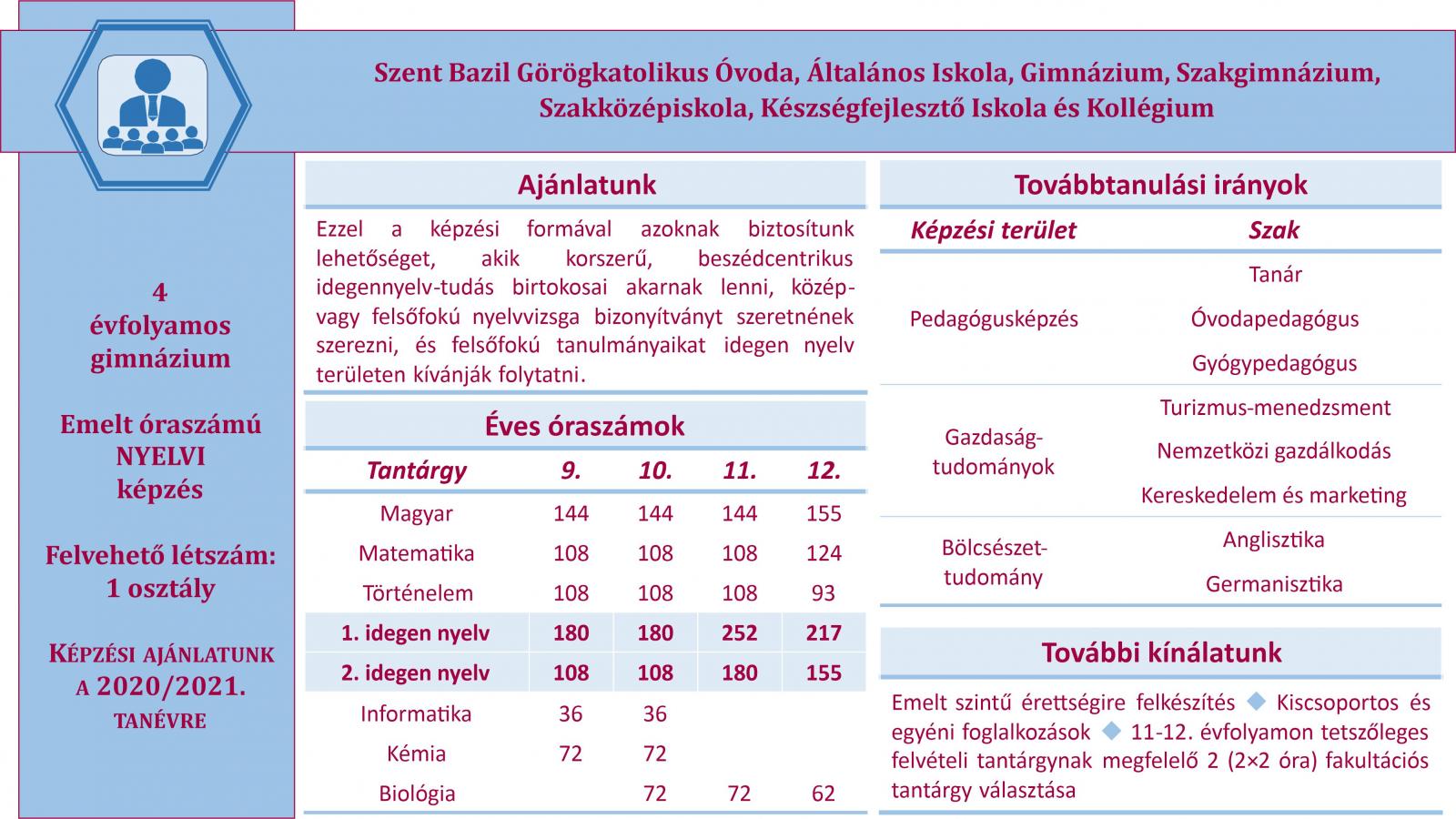 Továbbtanulási lehetőség: tanár, óvodapedagógus, gyógypedagógus, turizmus-menedzsment, nemzetközi gazdálkodás, kereskedelem és marketing, anglisztika, germanisztika.