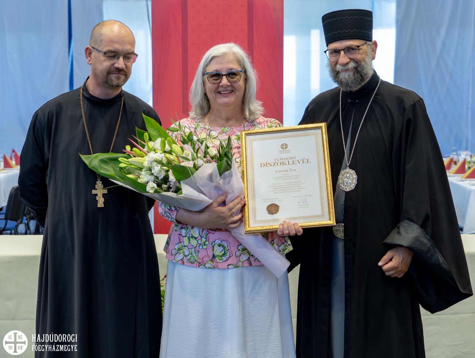 Végül, de nem utolsó sorban Kocsis Fülöp és Seszták István atya elismerő oklevelet adott át Czövek Éva részére, a Hajdúdorogi Főegyházmegye oktatási intézményeinek megszervezéséért végzett fáradhatatlan munkájáért és azok vezetésében betöltött évtizedes szolgálatáért. Pedagógusi hivatásra született, s ezt osztályfőnkként, intézményvezetőként, főtanácsosként és főigazgatóként is bebizonyította. Hivatását szakmailag felkészülten, fáradhatatlanul, mégis végtelen alázattal végzi. 2015 óta dolgozik a főegyházmegye oktatási referenseként.