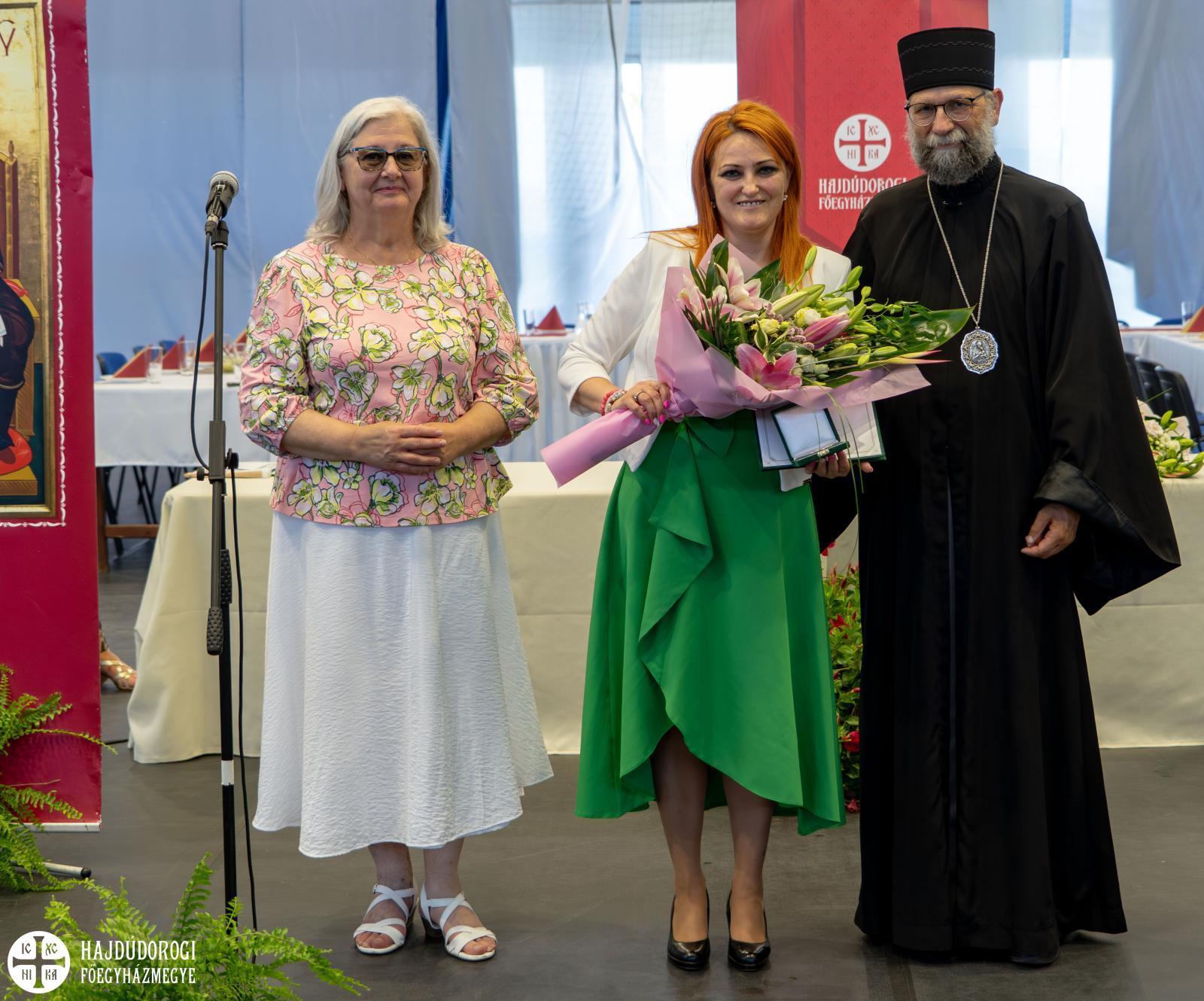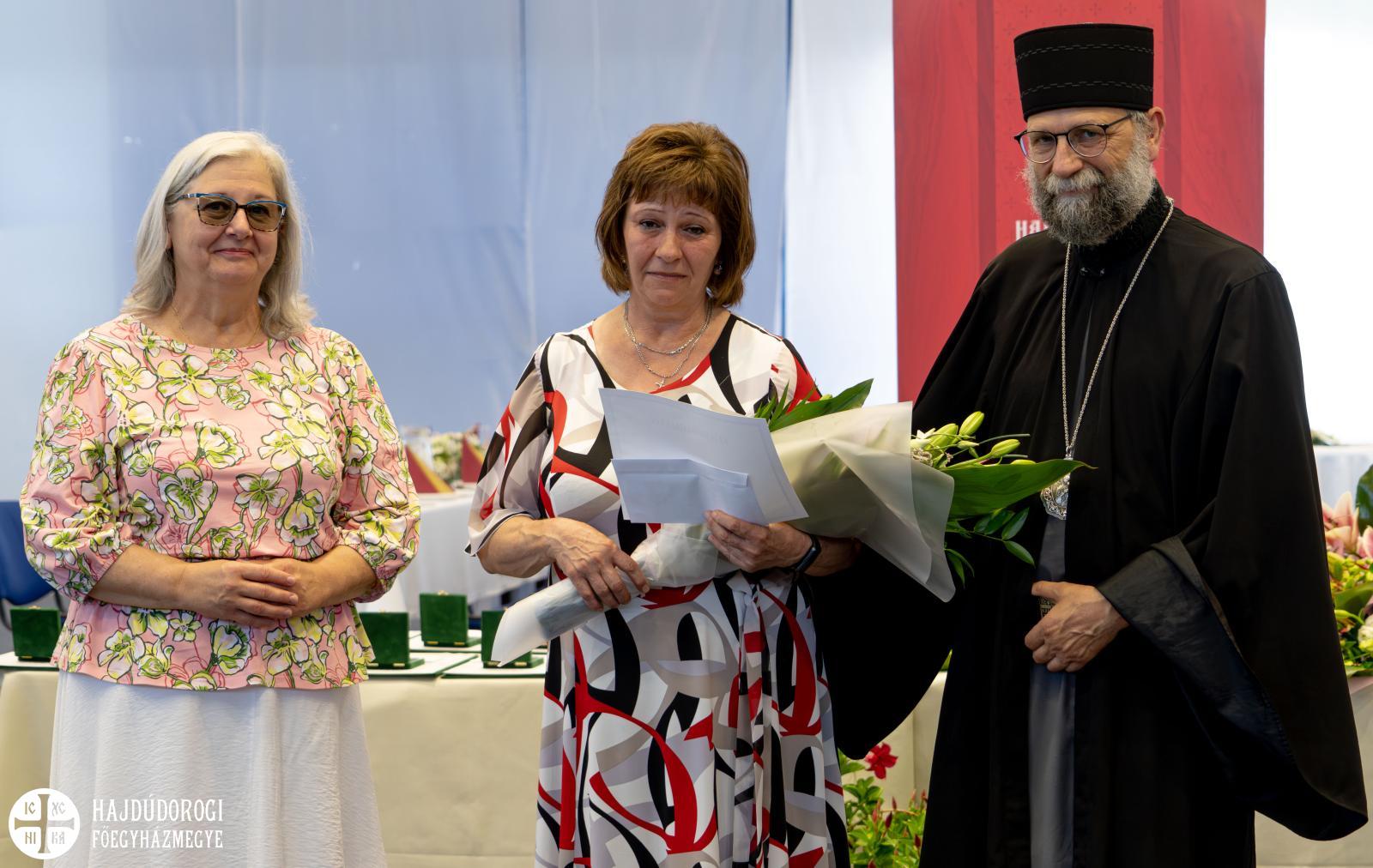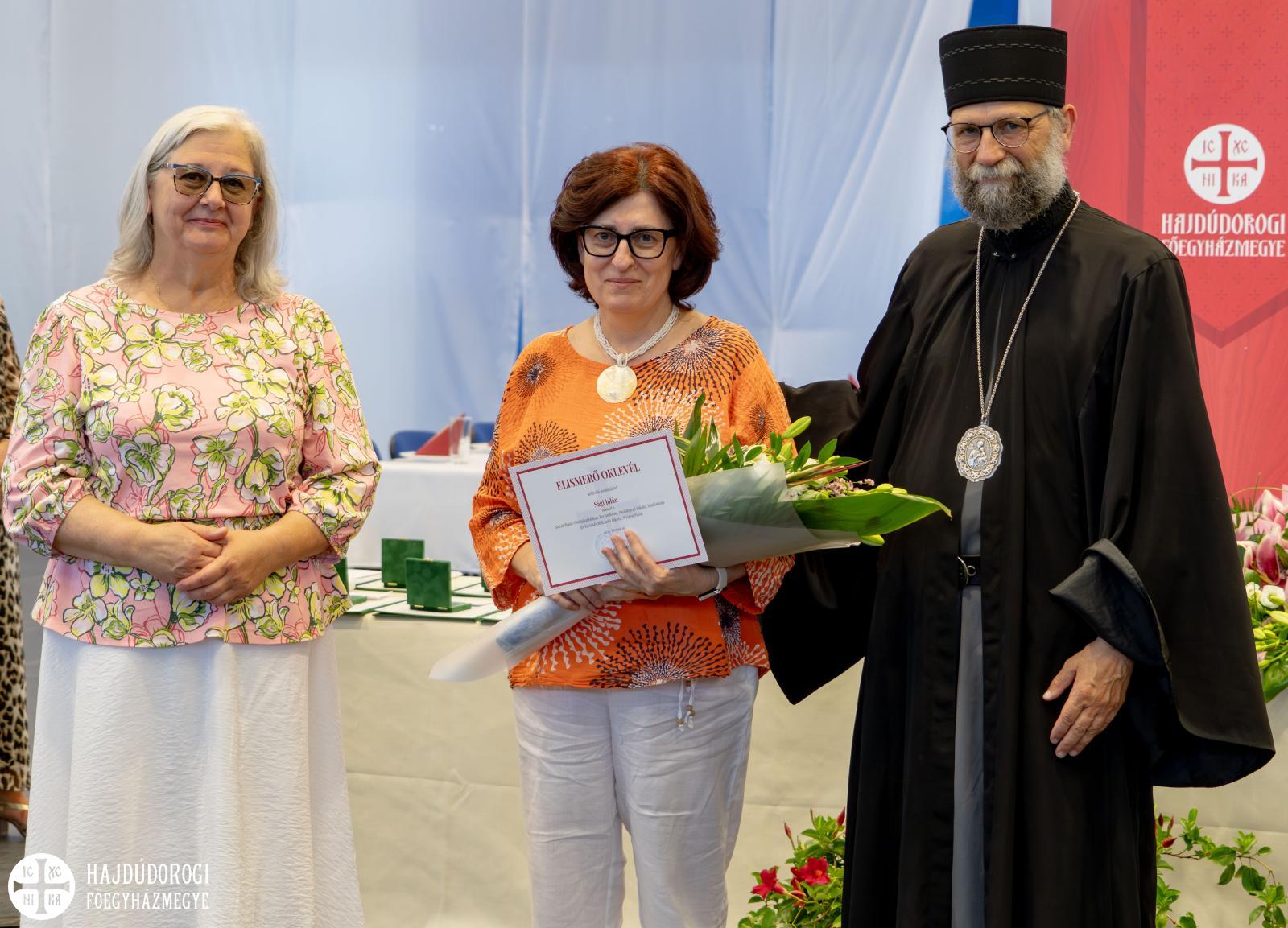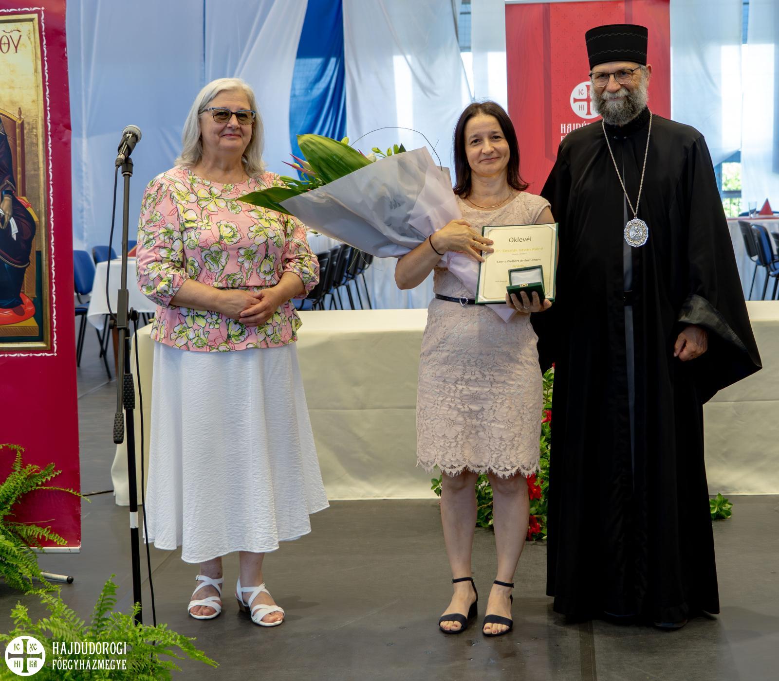 Díszoklevelet vett át Deák Györgyné, a nyíradonyi Szent Mihály Görögkatolikus Óvoda, Általános Iskola gazdasági ügyintézője, akit lelkiismeretes, szorgalmas, példamutató, precíz és gyermekcentrikus munkavégzés, példamutató hitélet jellemez. A szülőkkel, kollégákkal közvetlen, jó kapcsolatot ápol.